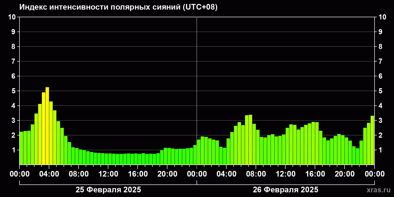 Изменения индекса интенсивности полярных сияний с 2025-02-25 по 2025-02-26 по местному времени