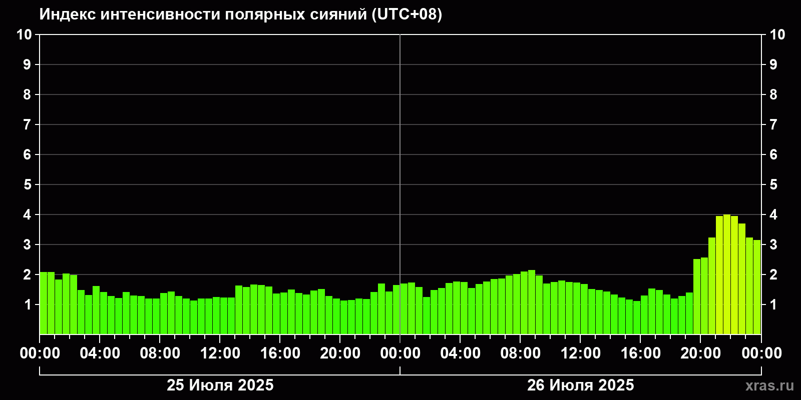 Изменения индекса интенсивности полярных сияний с 2025-07-25 по 2025-07-26 по местному времени