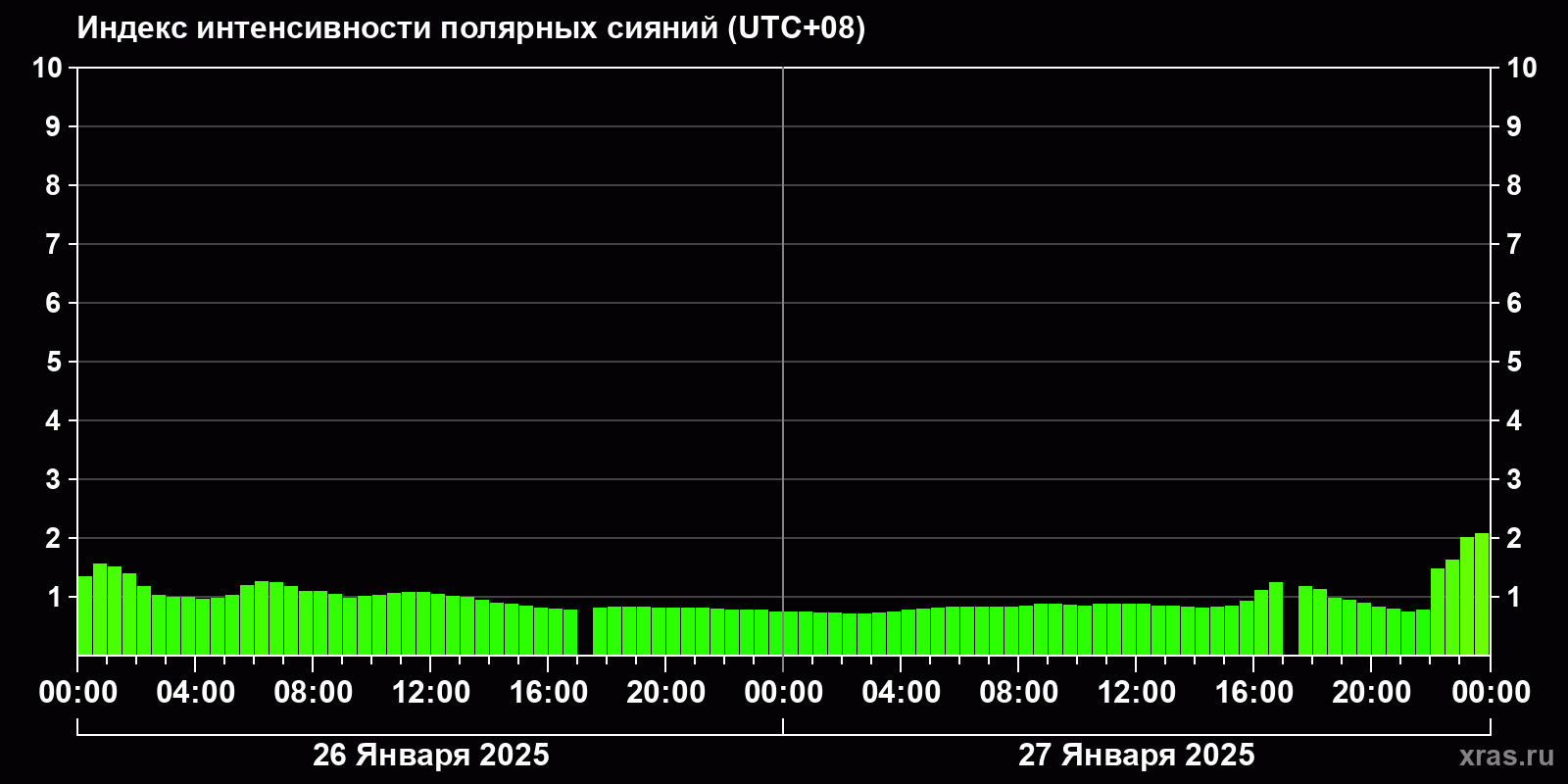 Изменения индекса интенсивности полярных сияний с 2025-01-26 по 2025-01-27 по местному времени