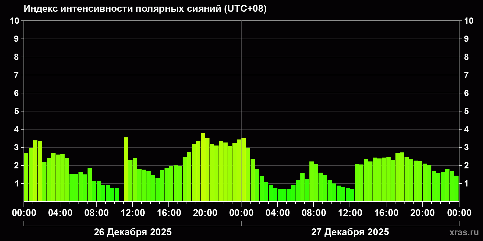 Изменения индекса интенсивности полярных сияний с 2025-12-26 по 2025-12-27 по местному времени