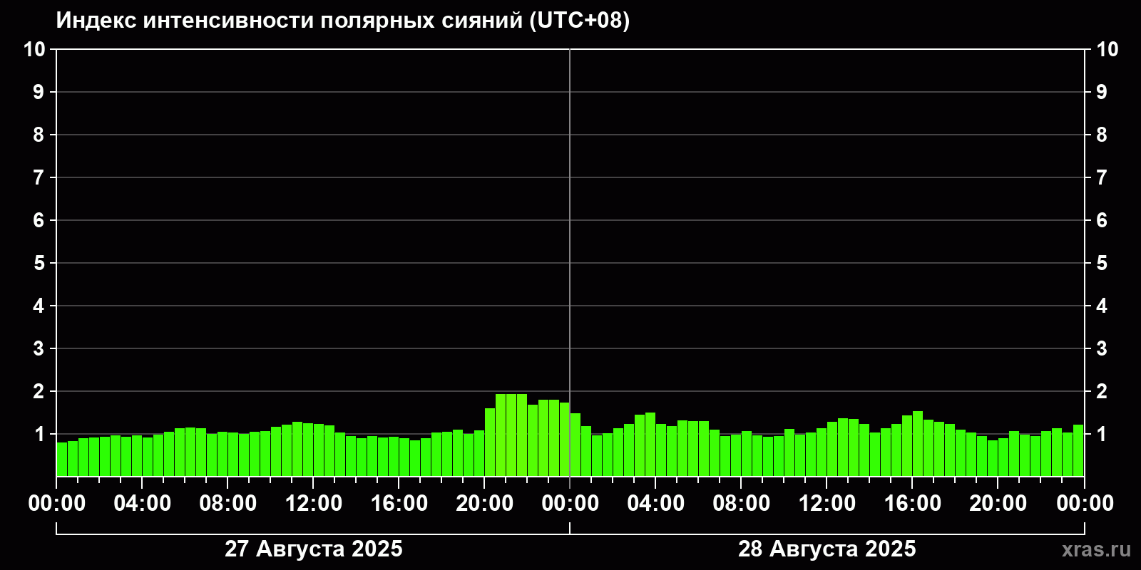 Изменения индекса интенсивности полярных сияний с 2025-08-27 по 2025-08-28 по местному времени