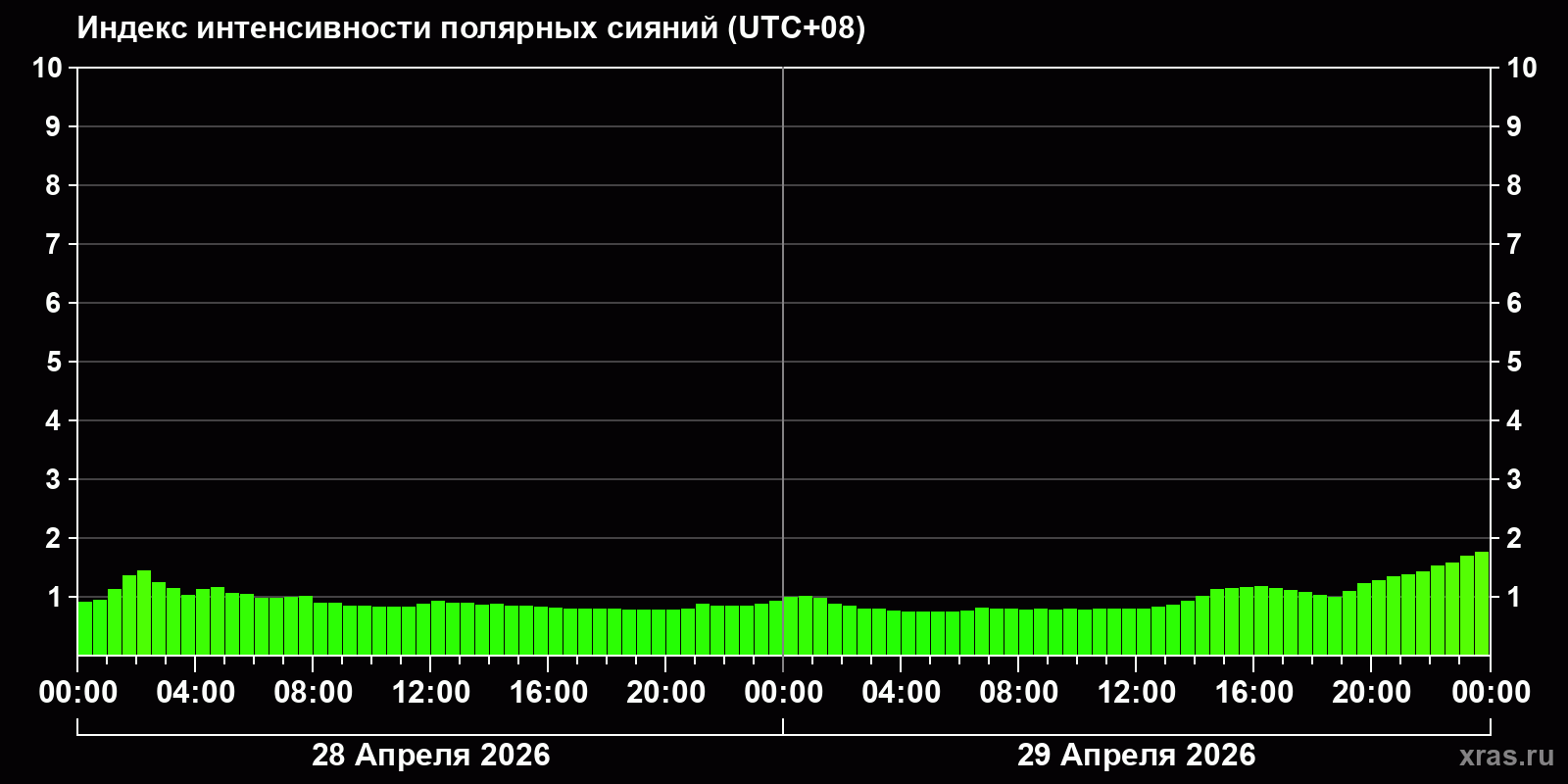 Изменения индекса интенсивности полярных сияний с 2026-04-28 по 2026-04-29 по местному времени
