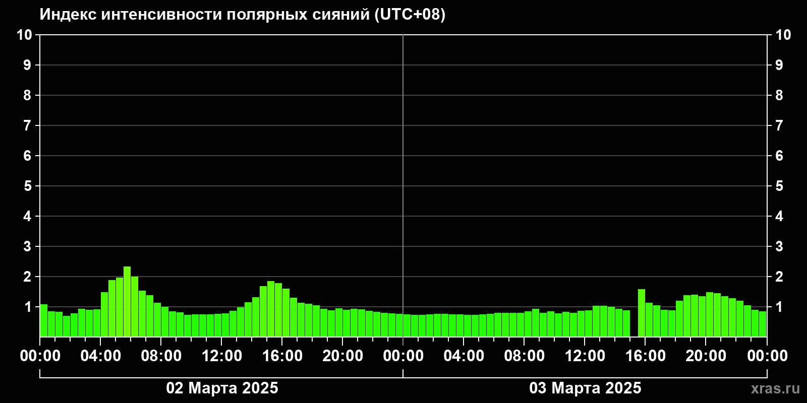 Изменения индекса интенсивности полярных сияний с 2025-03-02 по 2025-03-03 по местному времени