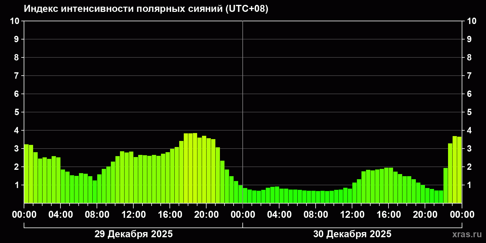 Изменения индекса интенсивности полярных сияний с 2025-12-29 по 2025-12-30 по местному времени
