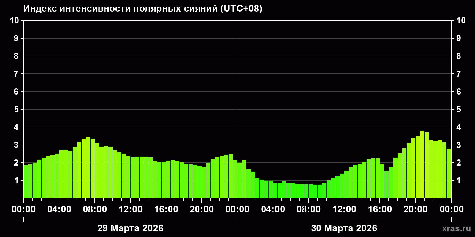 Изменения индекса интенсивности полярных сияний с 2026-03-29 по 2026-03-30 по местному времени