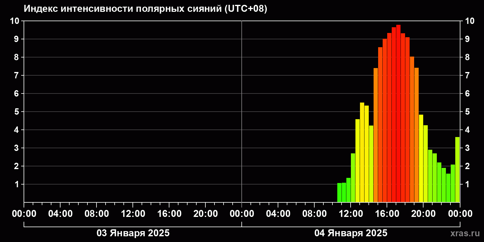 Изменения индекса интенсивности полярных сияний с 2025-01-03 по 2025-01-04 по местному времени