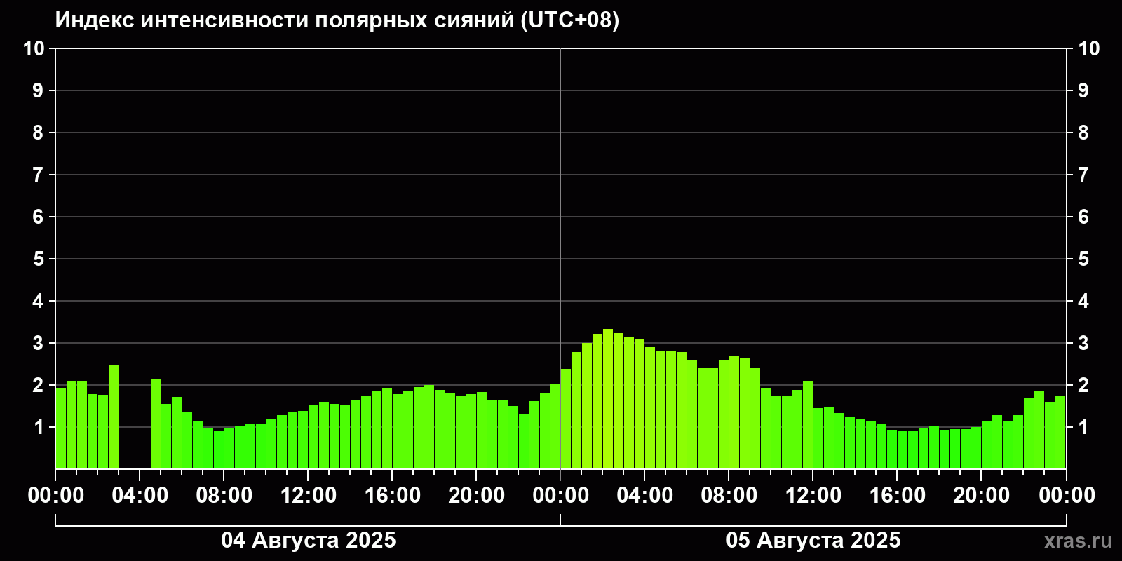 Изменения индекса интенсивности полярных сияний с 2025-08-04 по 2025-08-05 по местному времени