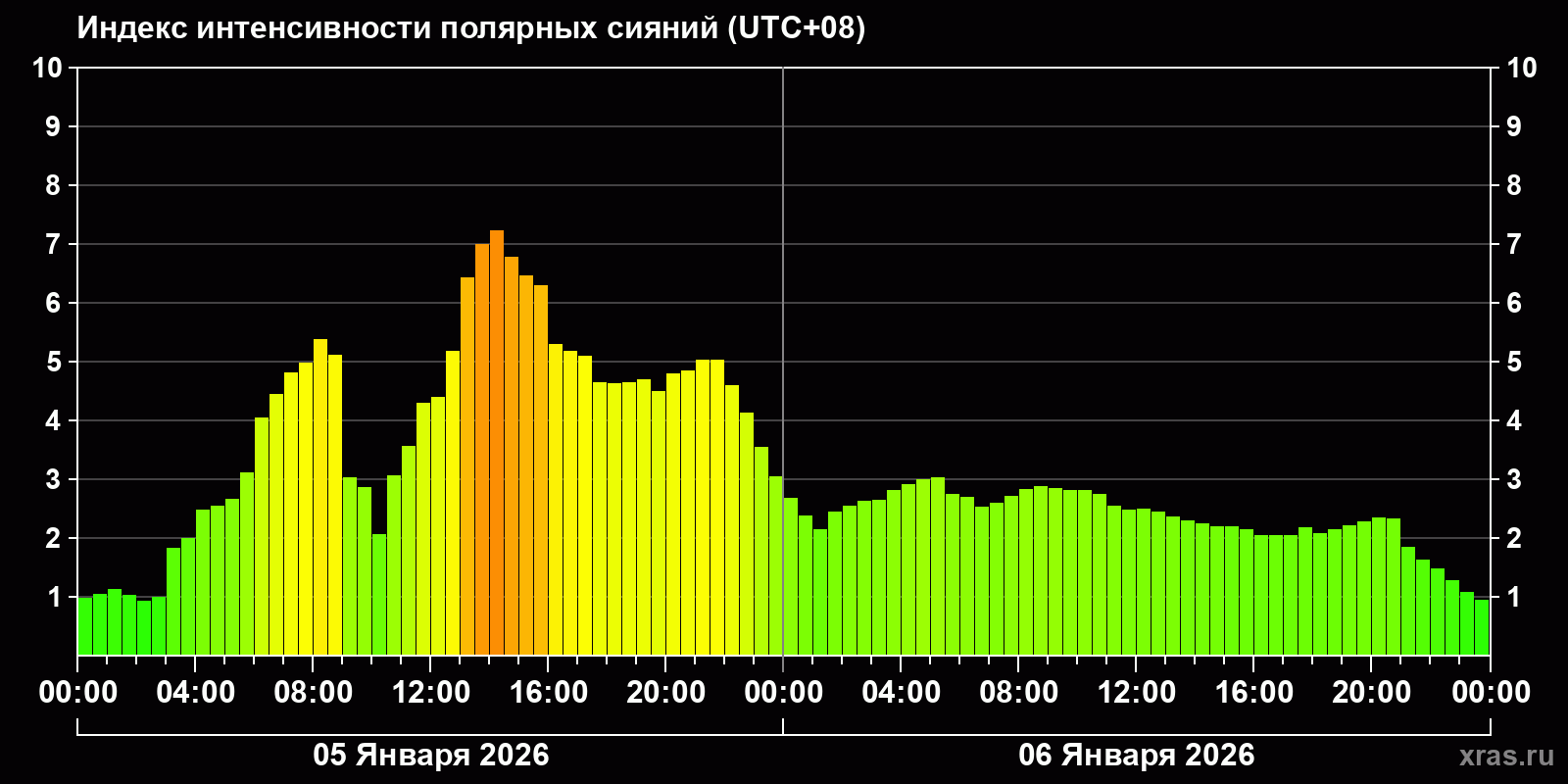 Изменения индекса интенсивности полярных сияний с 2026-01-05 по 2026-01-06 по местному времени