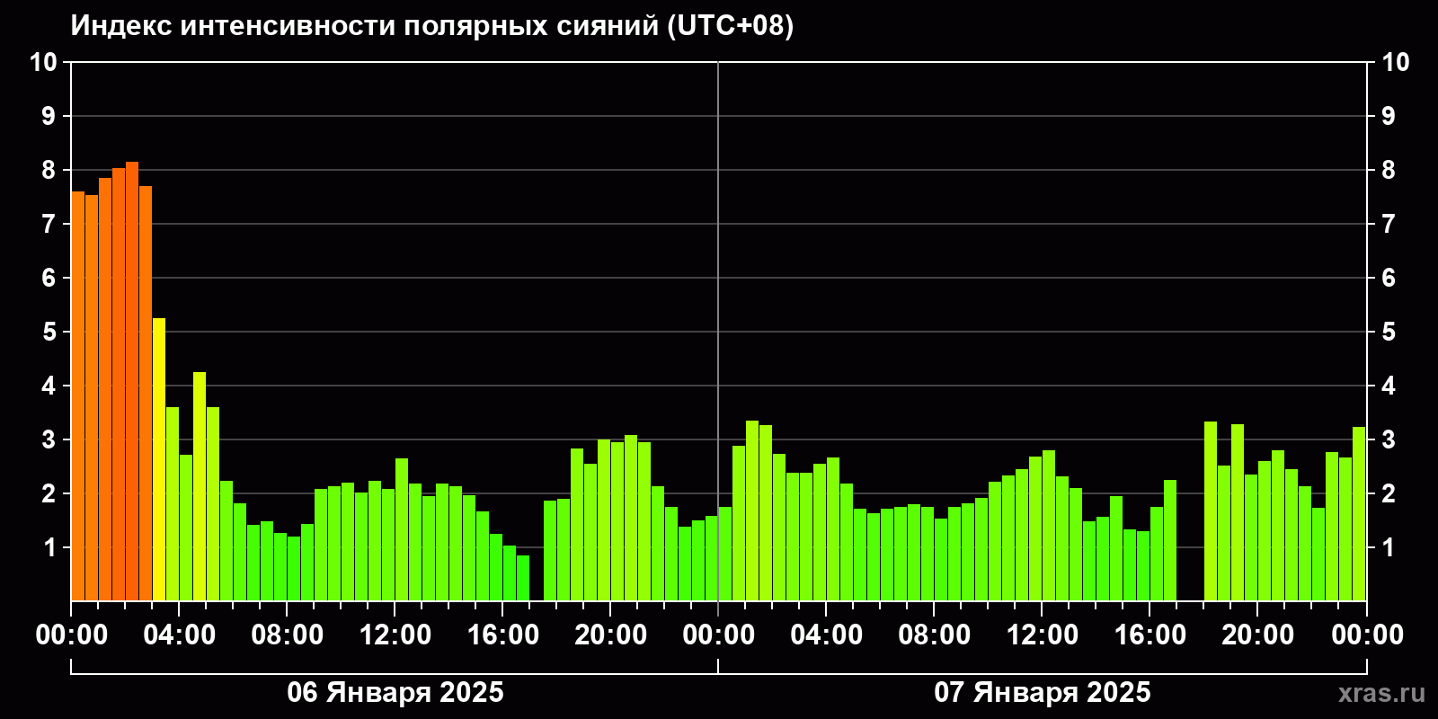 Изменения индекса интенсивности полярных сияний с 2025-01-06 по 2025-01-07 по местному времени
