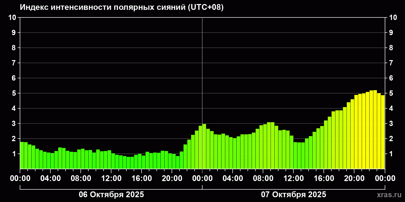 Изменения индекса интенсивности полярных сияний с 2025-10-06 по 2025-10-07 по местному времени
