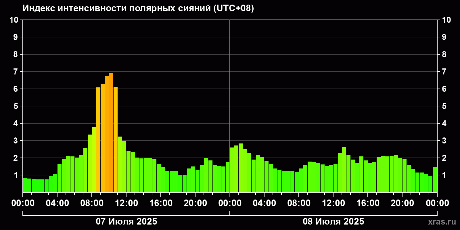 Изменения индекса интенсивности полярных сияний с 2025-07-07 по 2025-07-08 по местному времени