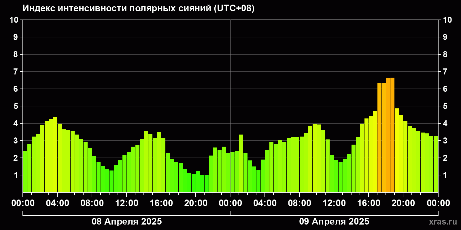 Изменения индекса интенсивности полярных сияний с 2025-04-08 по 2025-04-09 по местному времени