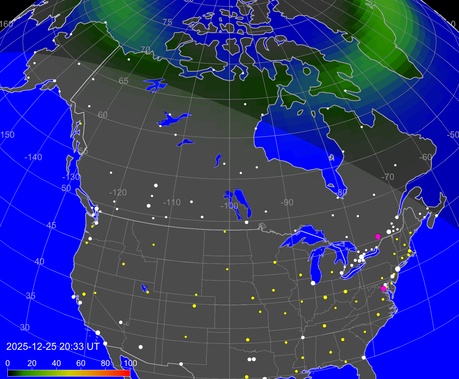 Зона полярных (северных) сияний над территорией Северной Америки