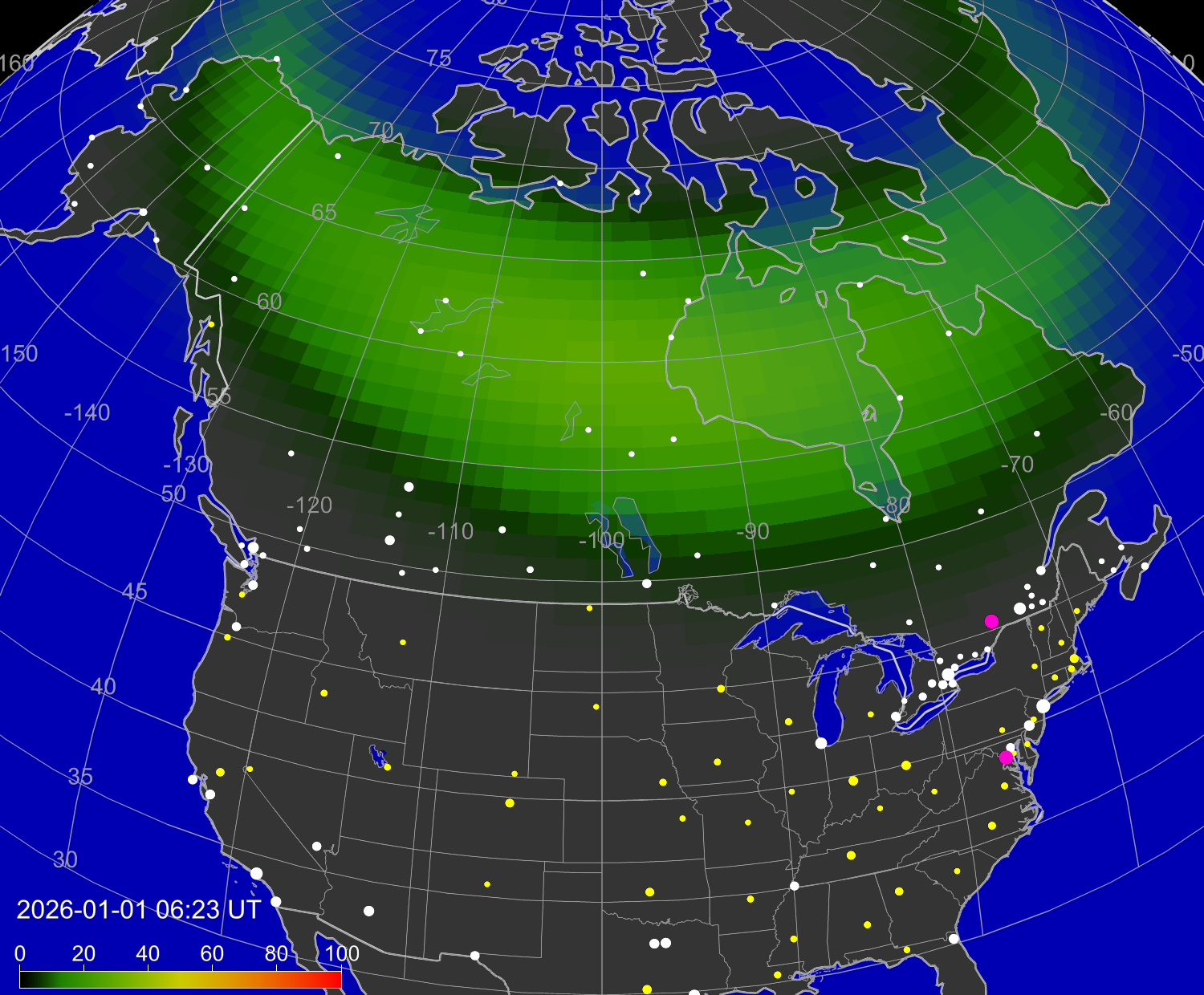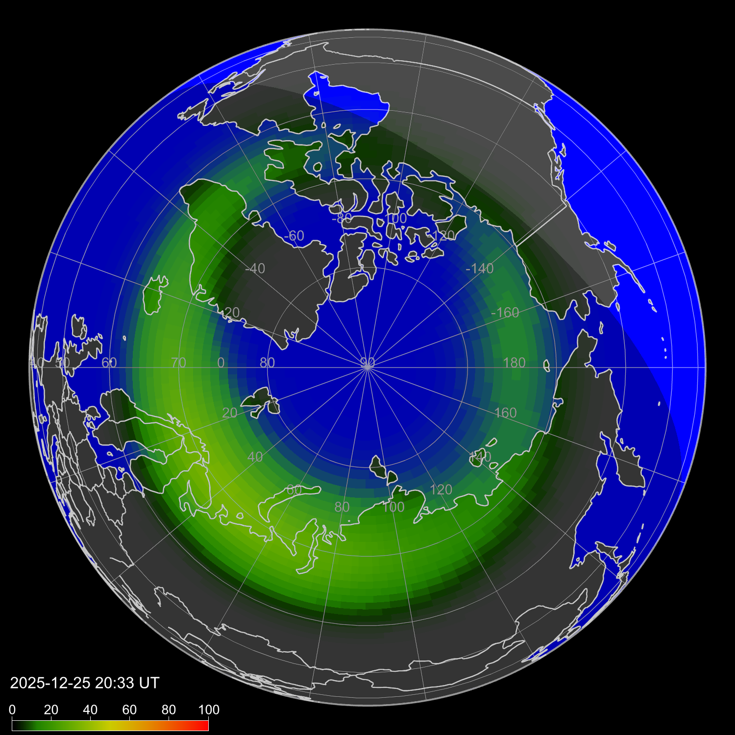 Индекс интенсивности полярных сияний и теоретически возможная широта наблюдений для ночного времени в западном полушарии