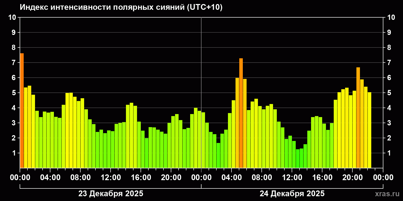 Изменения и часовой прогноз индекса интенсивности полярных сияний с 2025-12-23 по 2025-12-24