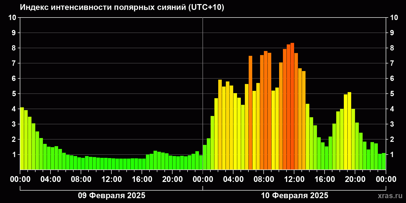 Изменения индекса интенсивности полярных сияний с 2025-02-09 по 2025-02-10 по местному времени