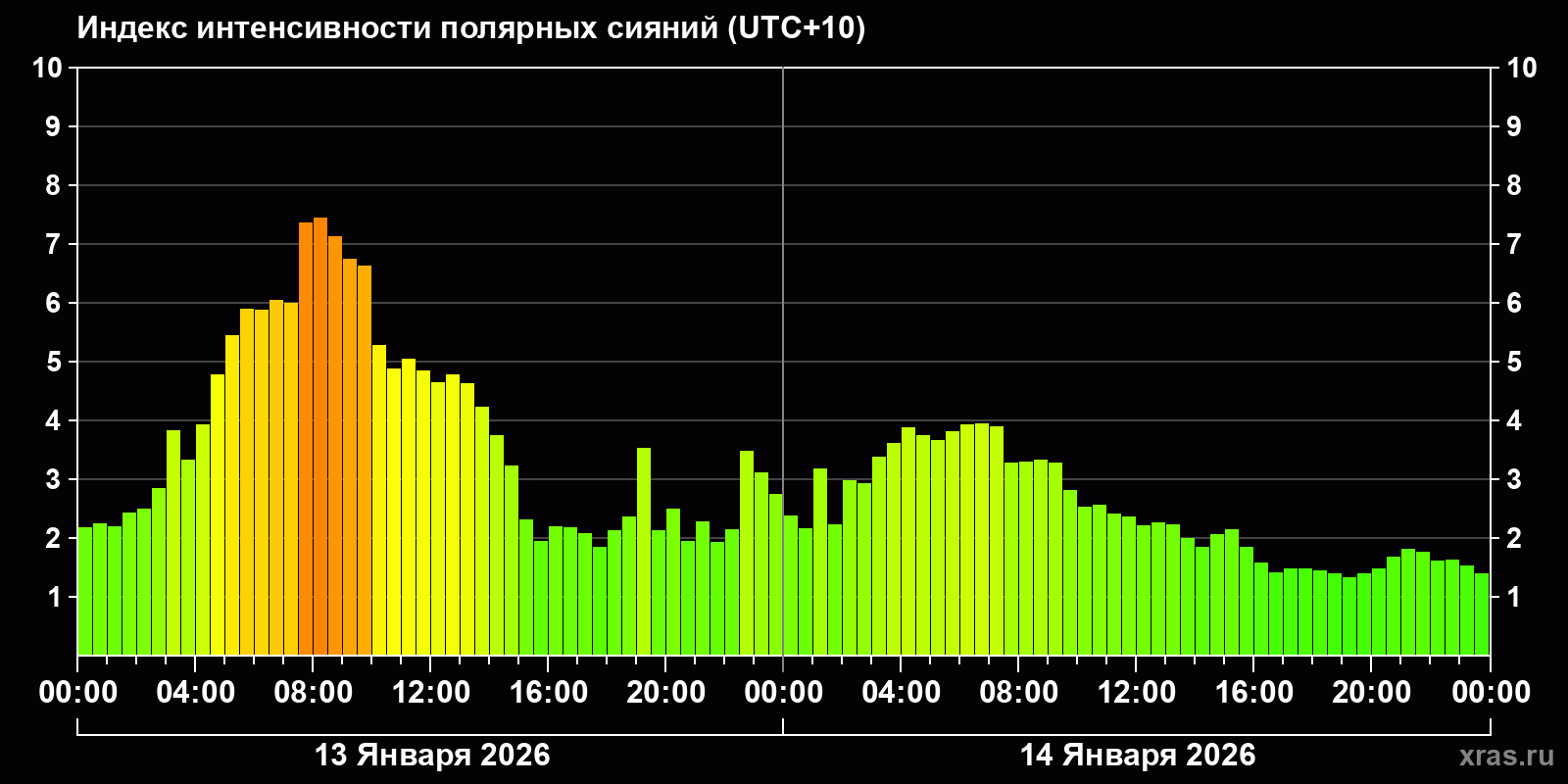 Изменения индекса интенсивности полярных сияний с 2026-01-13 по 2026-01-14 по местному времени
