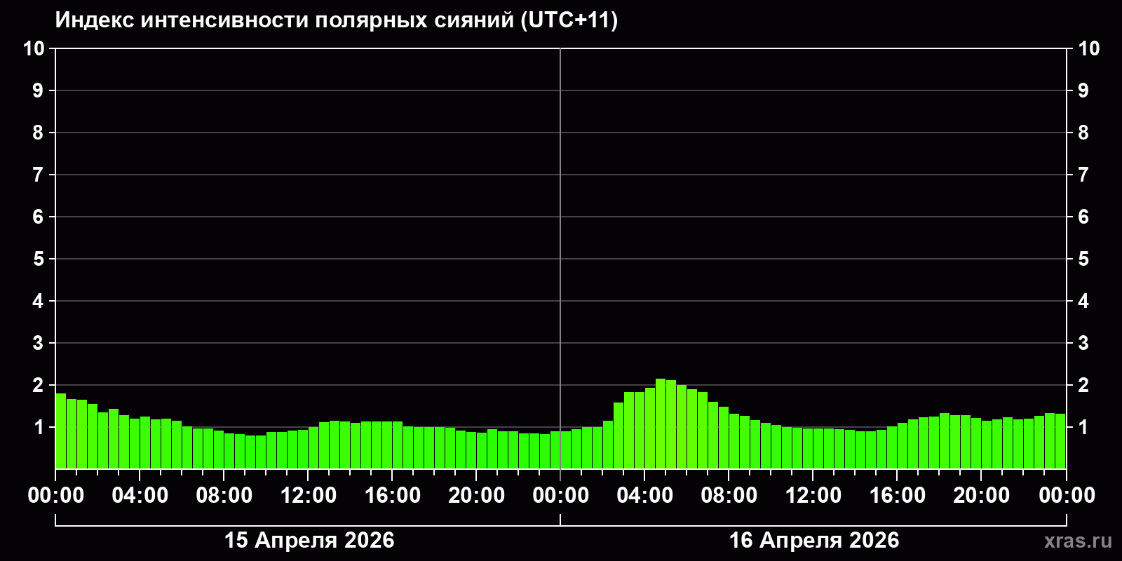 Изменения индекса интенсивности полярных сияний с 2026-04-15 по 2026-04-16 по местному времени