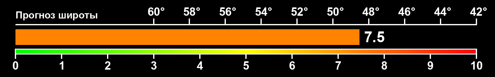 Индекс интенсивности полярных сияний и теоретически возможная широта наблюдений для ночного времени в западном полушарии по состоянию на 2026-04-03 00:46 (конец дня) по местному времени