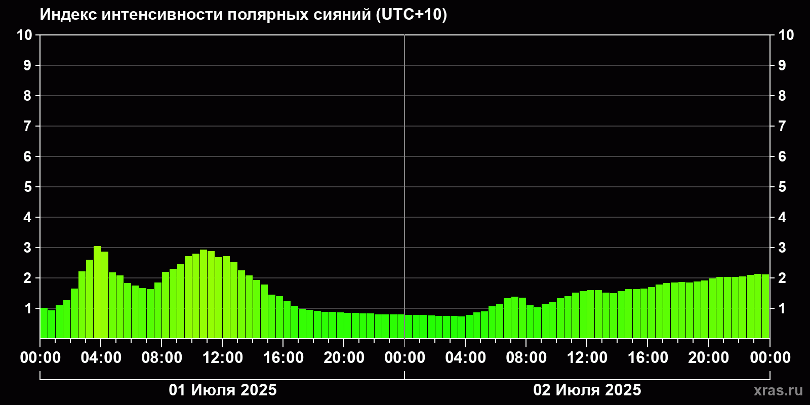 Изменения индекса интенсивности полярных сияний с 2025-07-02 по 2025-07-03 по местному времени
