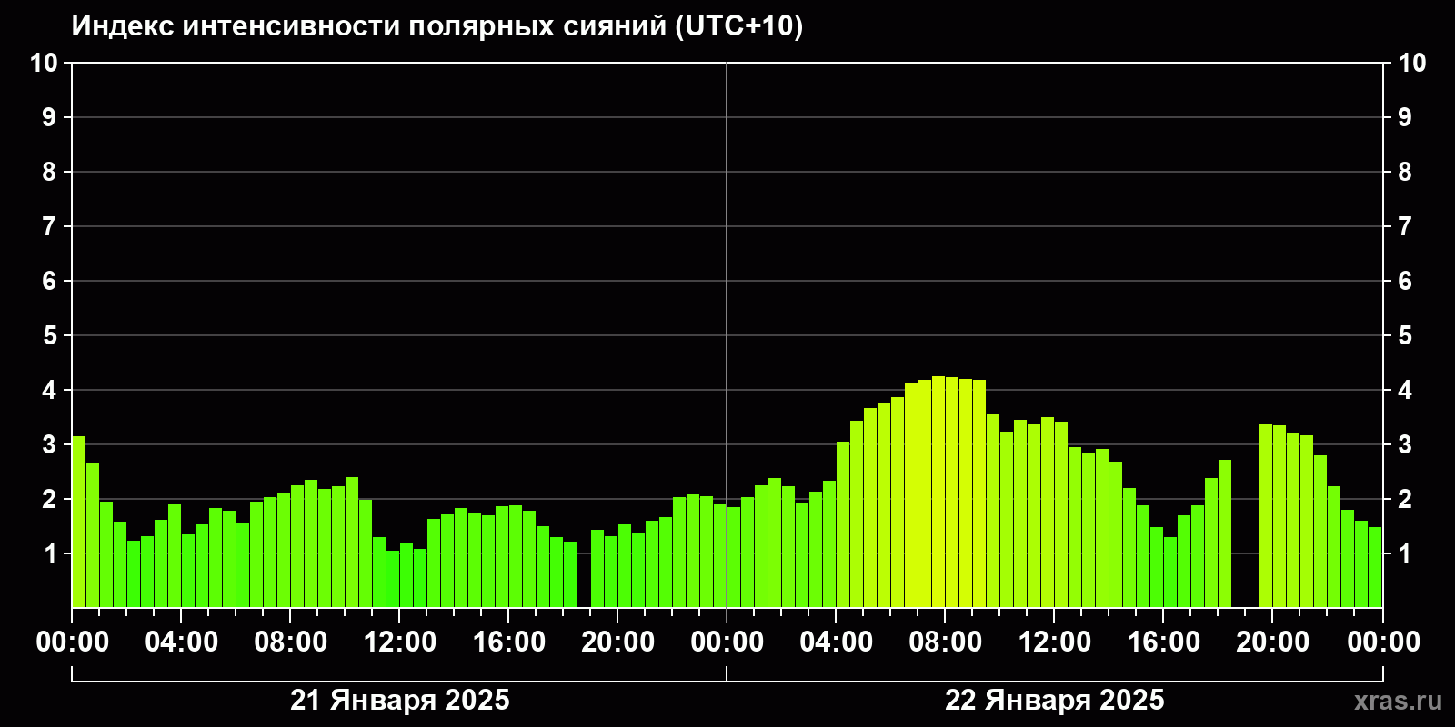 Изменения индекса интенсивности полярных сияний с 2025-01-21 по 2025-01-22 по местному времени