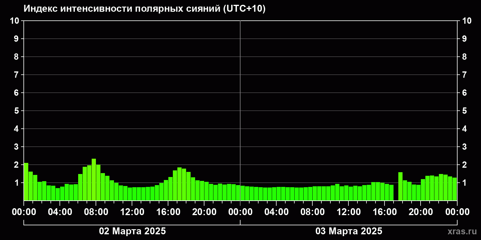 Изменения индекса интенсивности полярных сияний с 2025-03-02 по 2025-03-03 по местному времени