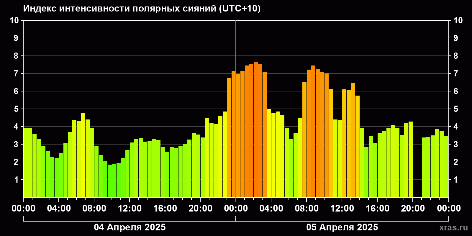 Изменения индекса интенсивности полярных сияний с 2025-04-05 по 2025-04-06 по местному времени