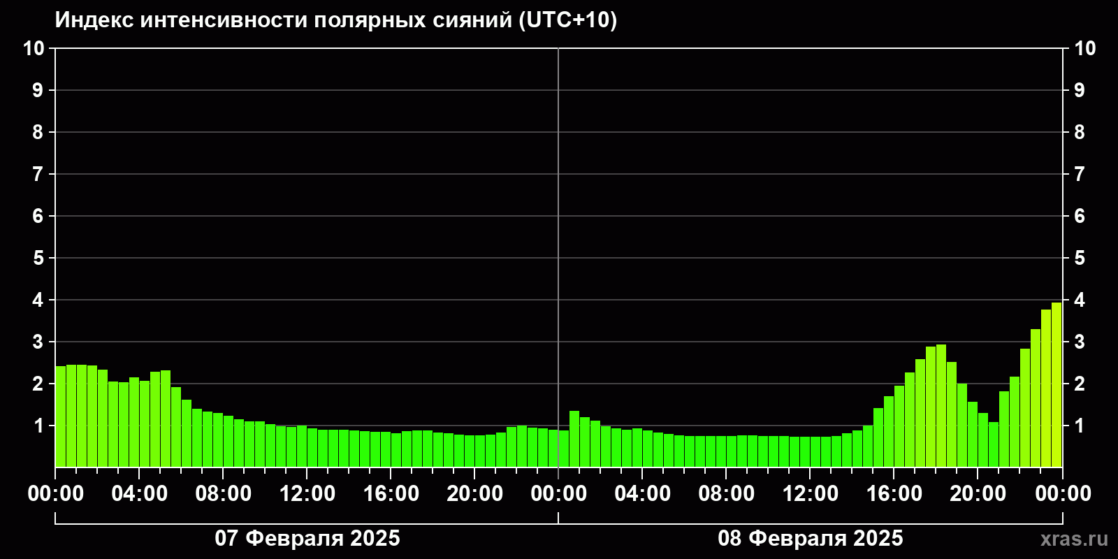 Изменения индекса интенсивности полярных сияний с 2025-02-07 по 2025-02-08 по местному времени
