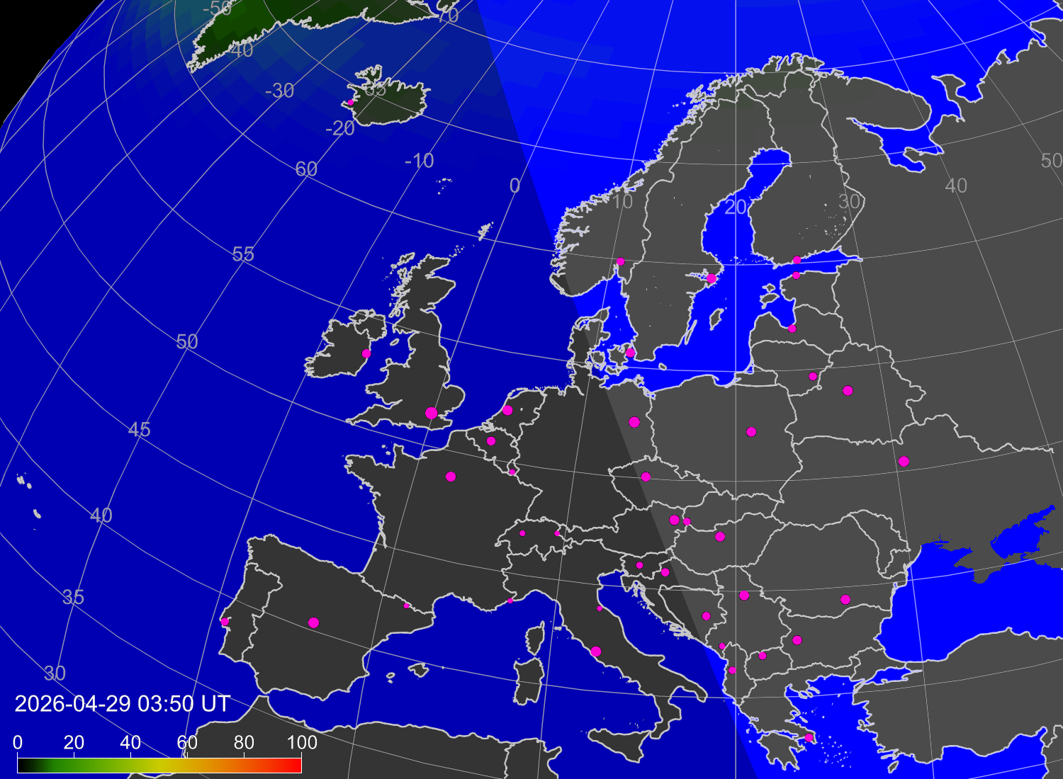 Индекс интенсивности полярных сияний и теоретически возможная широта наблюдений для ночного времени в восточном полушарии
