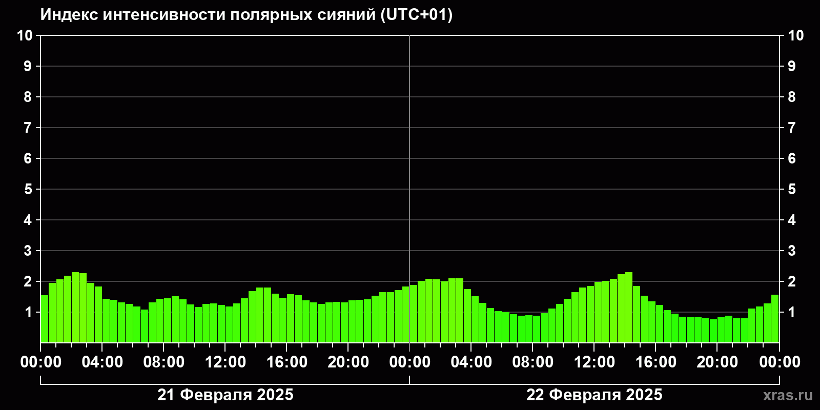 Изменения индекса интенсивности полярных сияний с 2025-02-21 по 2025-02-22 по местному времени