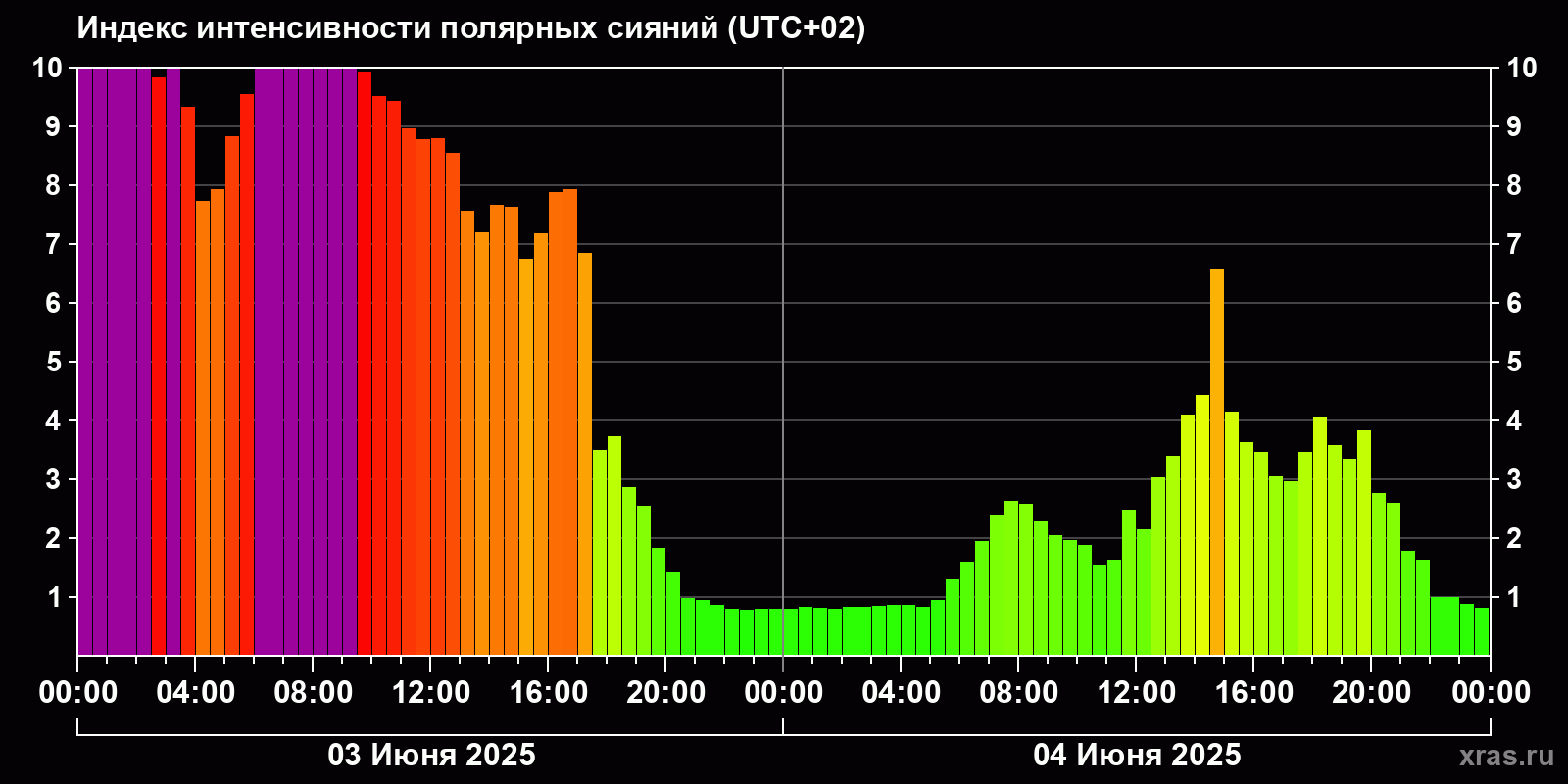 Изменения индекса интенсивности полярных сияний с 2025-06-03 по 2025-06-04 по местному времени