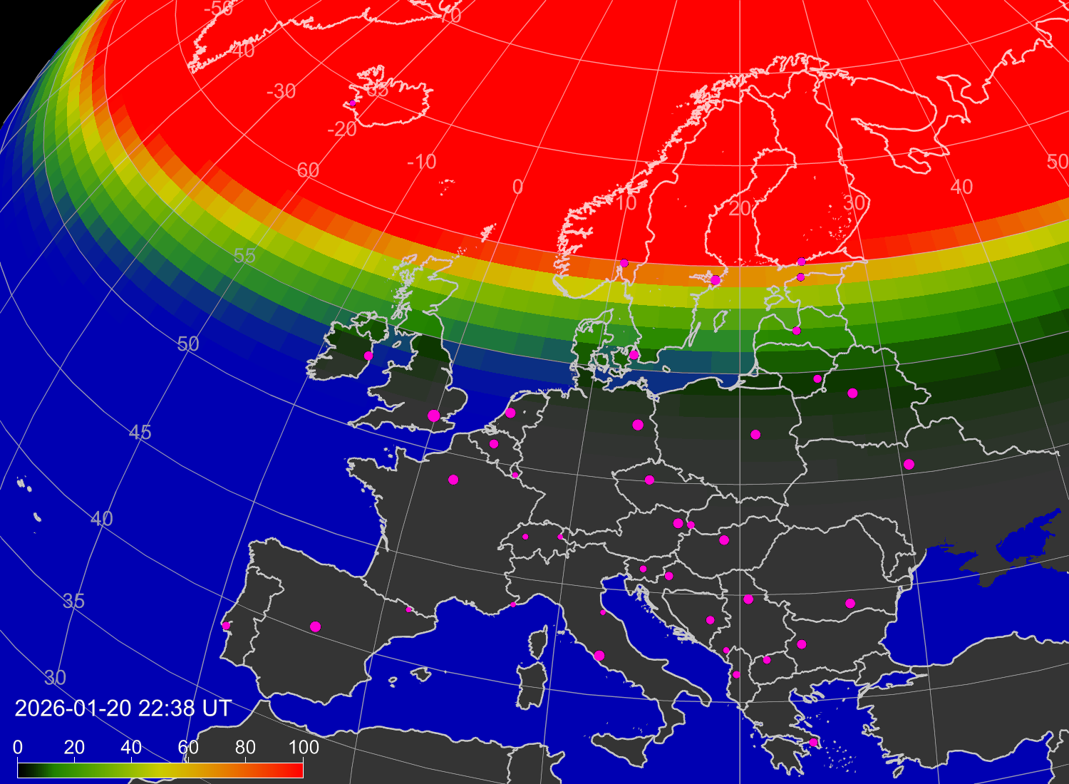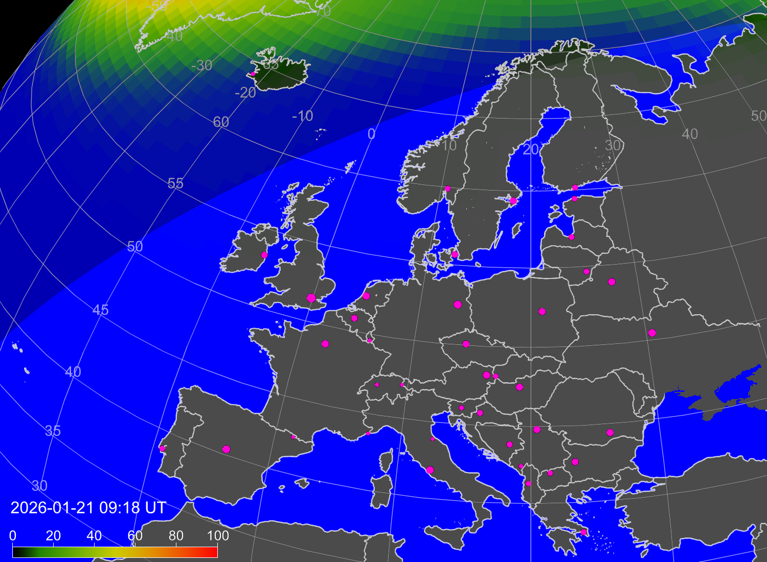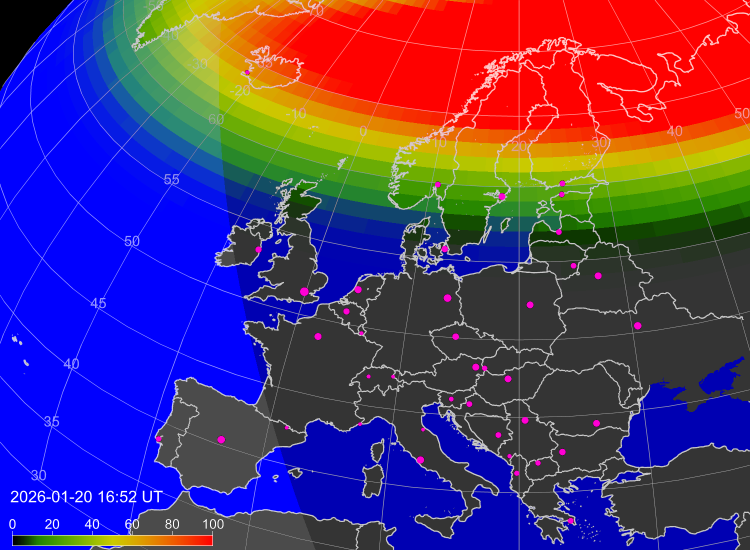 Вероятность полярных сияний в городах Европы