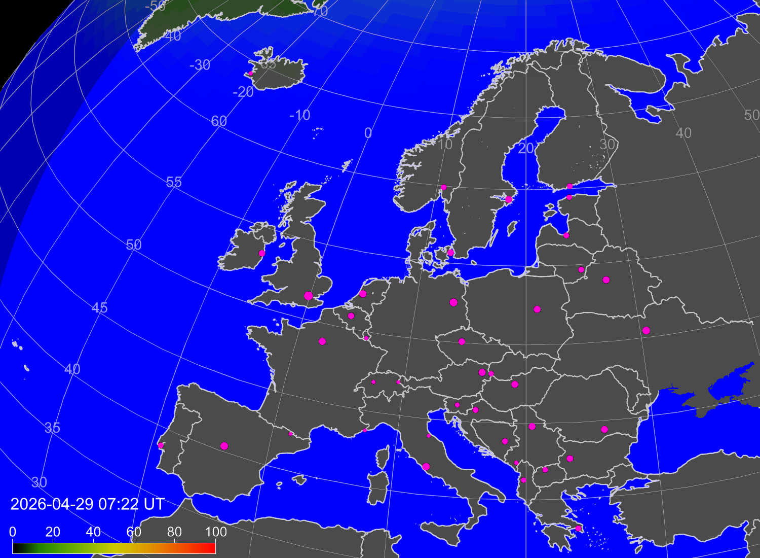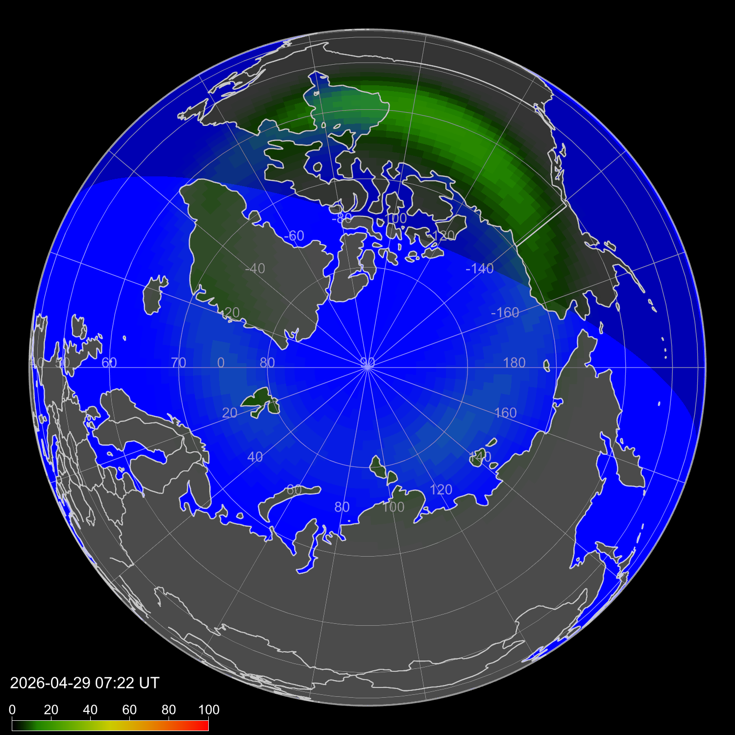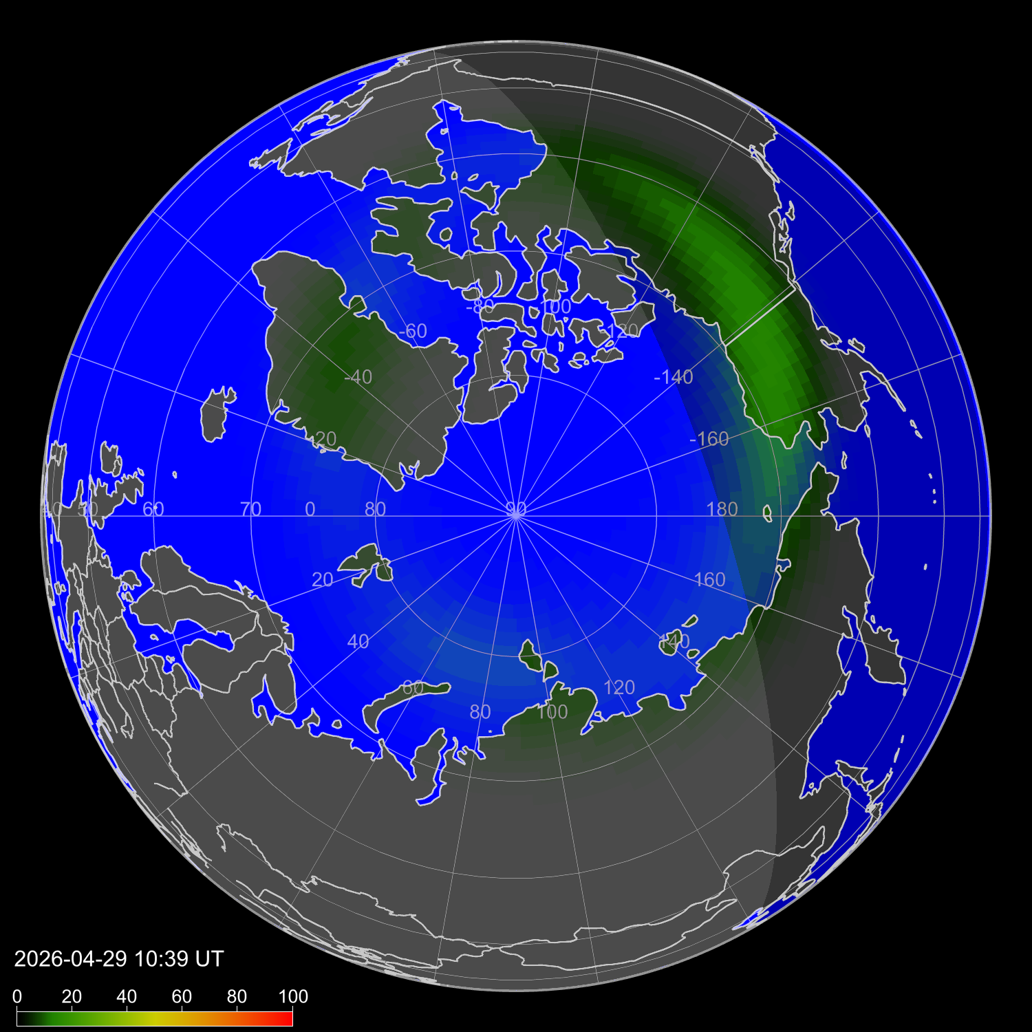 Индекс интенсивности полярных сияний и теоретически возможная широта наблюдений для ночного времени в восточном полушарии