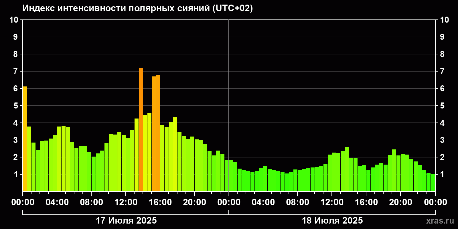 Изменения индекса интенсивности полярных сияний с 2025-07-17 по 2025-07-18 по местному времени