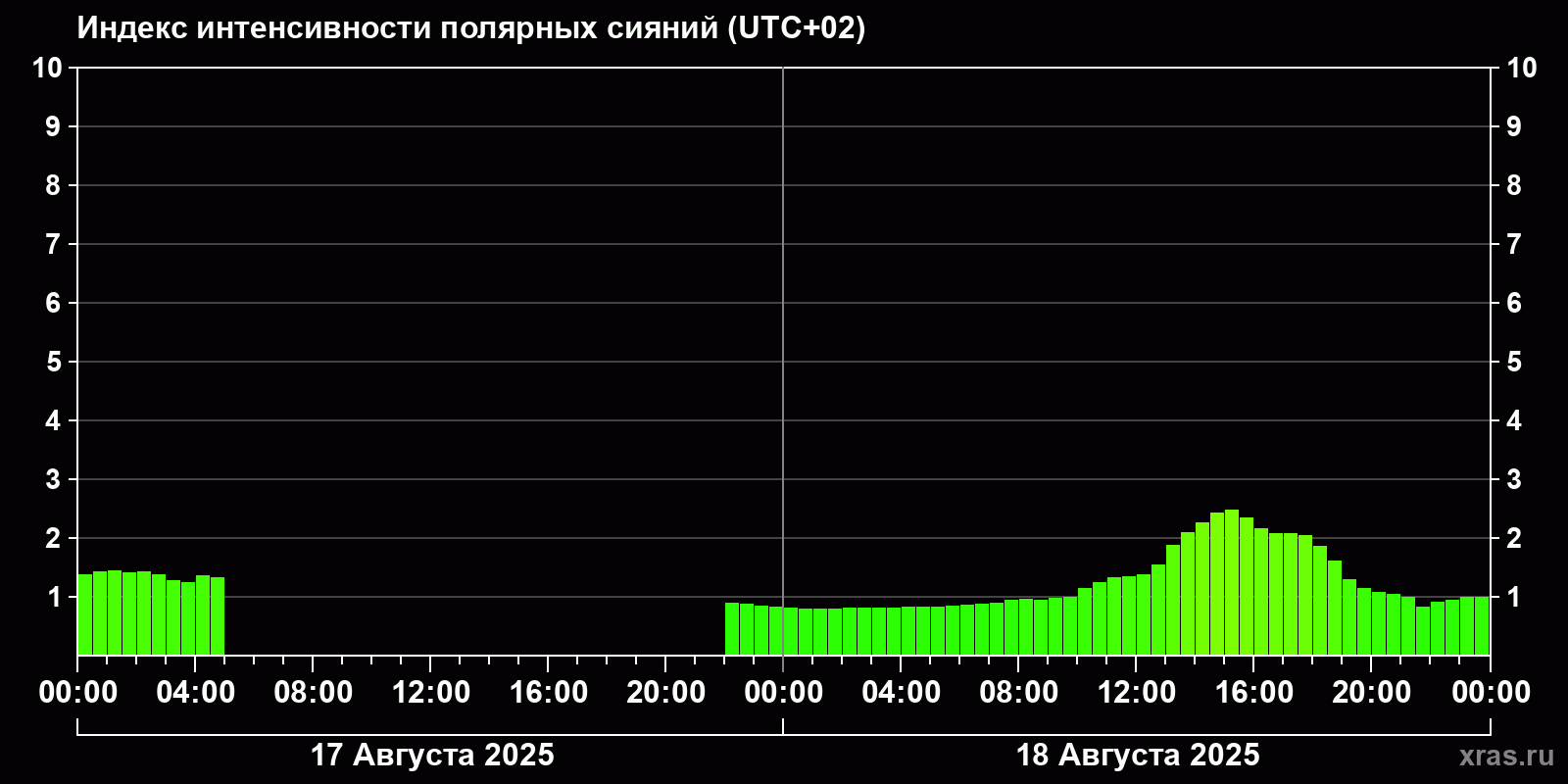 Изменения индекса интенсивности полярных сияний с 2025-08-17 по 2025-08-18 по местному времени
