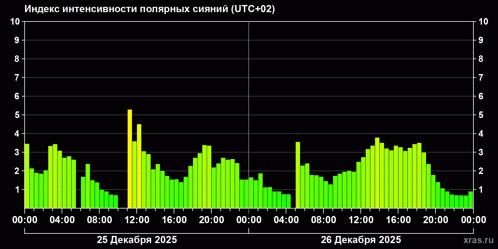 Изменения индекса интенсивности полярных сияний с 2025-12-25 по 2025-12-26 по местному времени