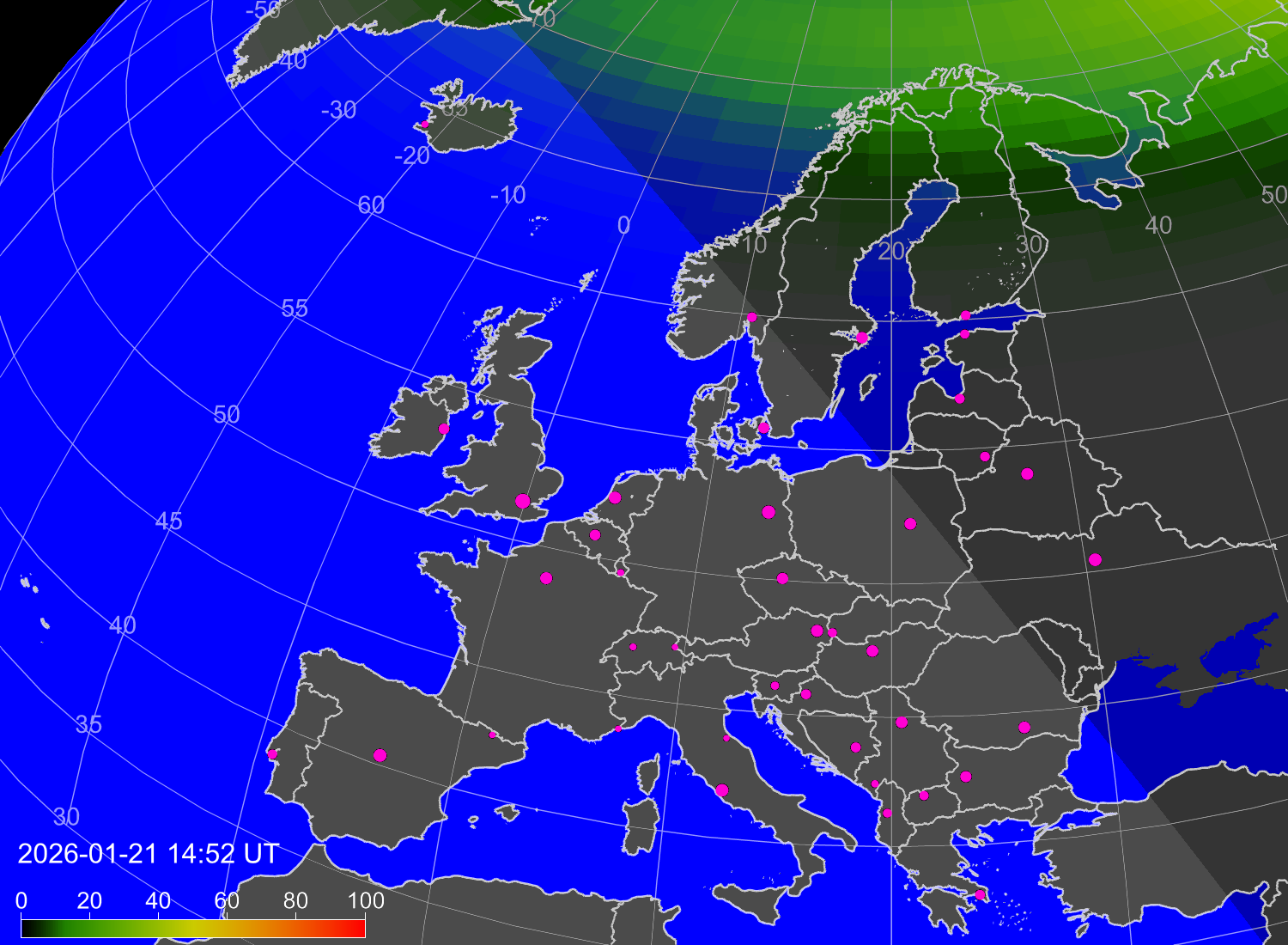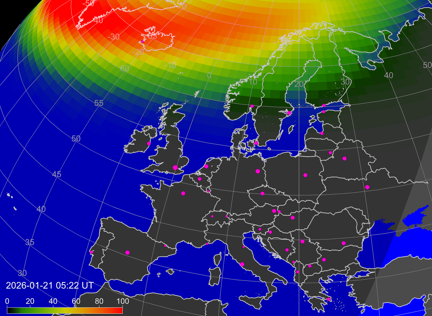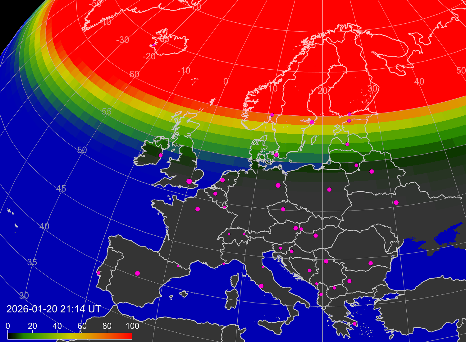 Вероятность полярных сияний в городах Европы