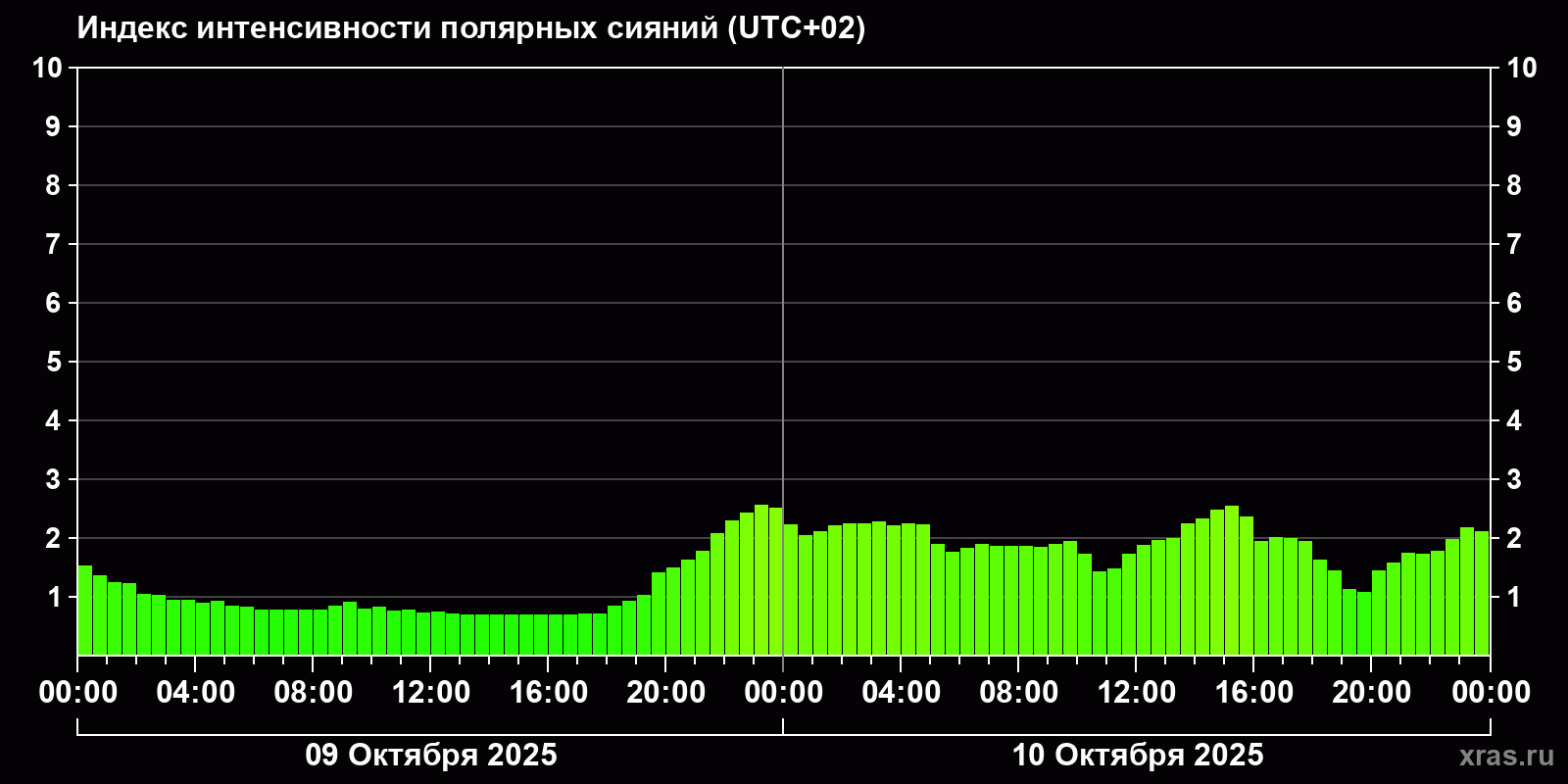 Изменения индекса интенсивности полярных сияний с 2025-10-09 по 2025-10-10 по местному времени