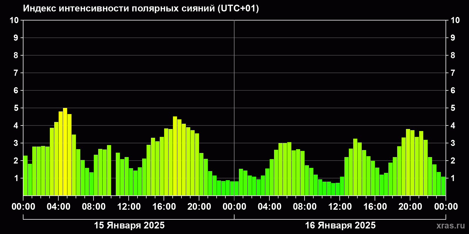 Изменения индекса интенсивности полярных сияний с 2025-01-15 по 2025-01-16 по местному времени