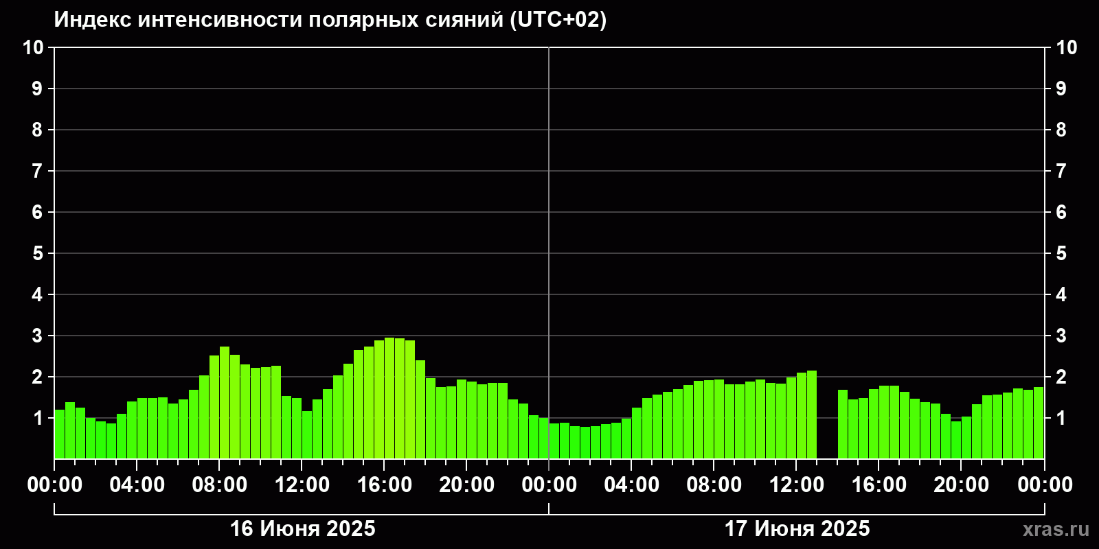 Изменения индекса интенсивности полярных сияний с 2025-06-16 по 2025-06-17 по местному времени