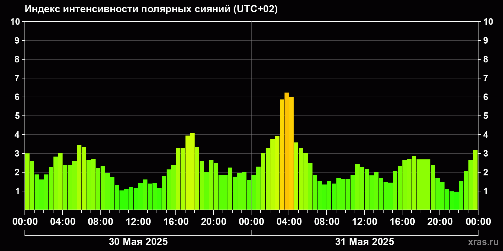 Изменения индекса интенсивности полярных сияний с 2025-05-30 по 2025-05-31 по местному времени