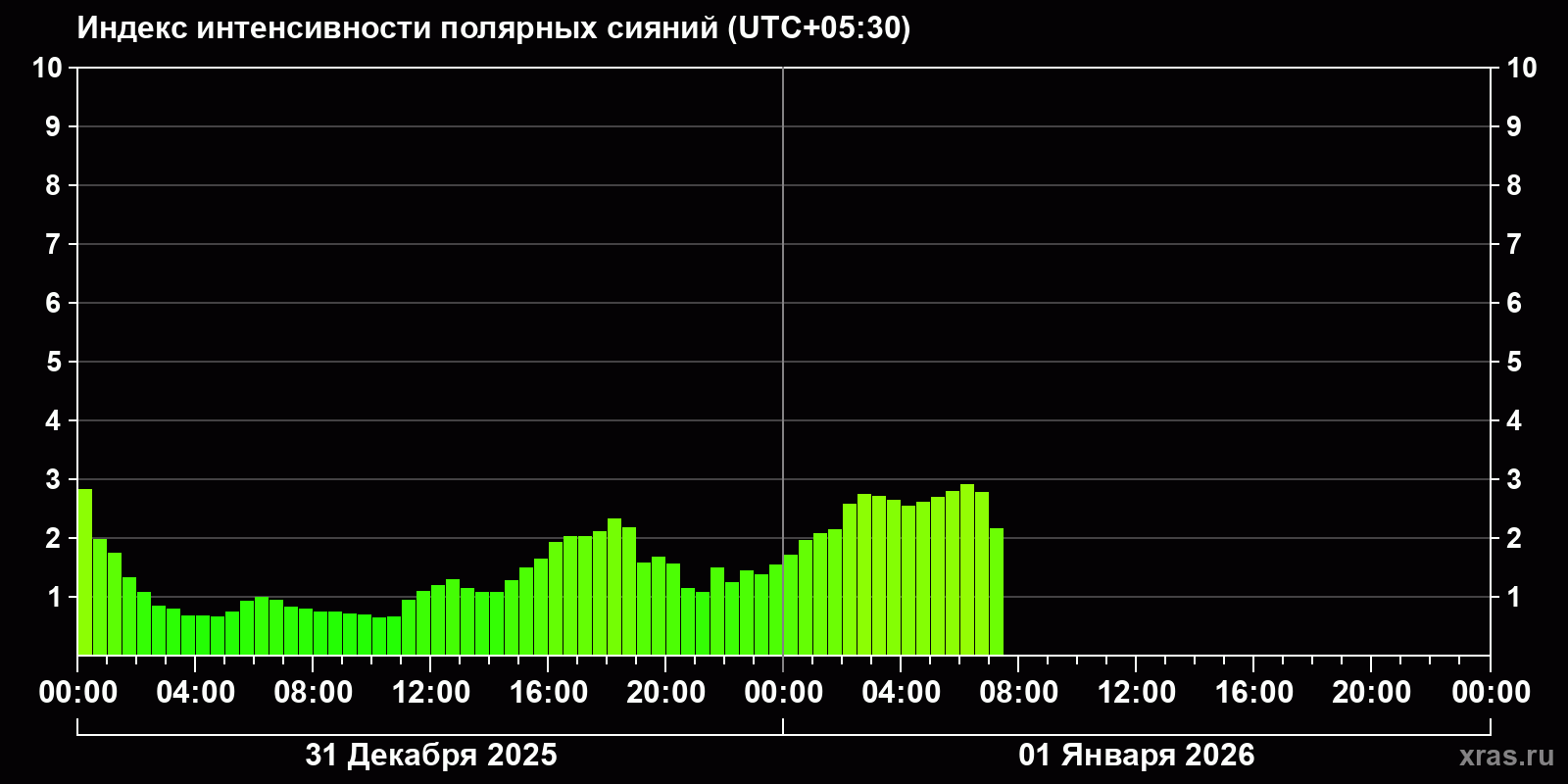 Изменения индекса интенсивности полярных сияний с 2025-12-31 по 2026-01-01 по местному времени
