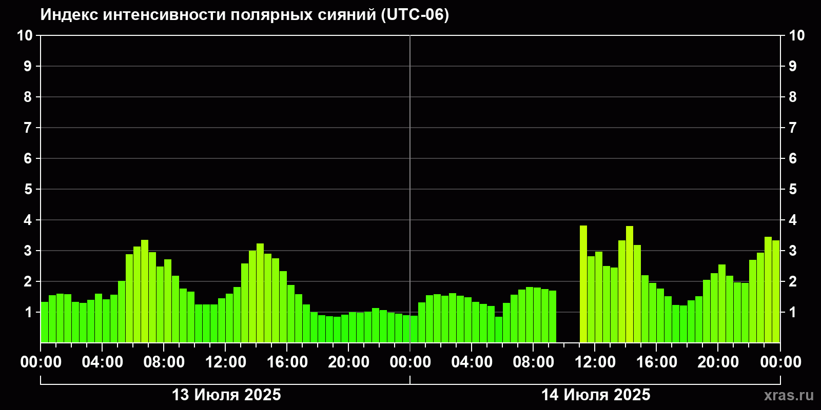 Изменения индекса интенсивности полярных сияний с 2025-07-13 по 2025-07-14 по местному времени
