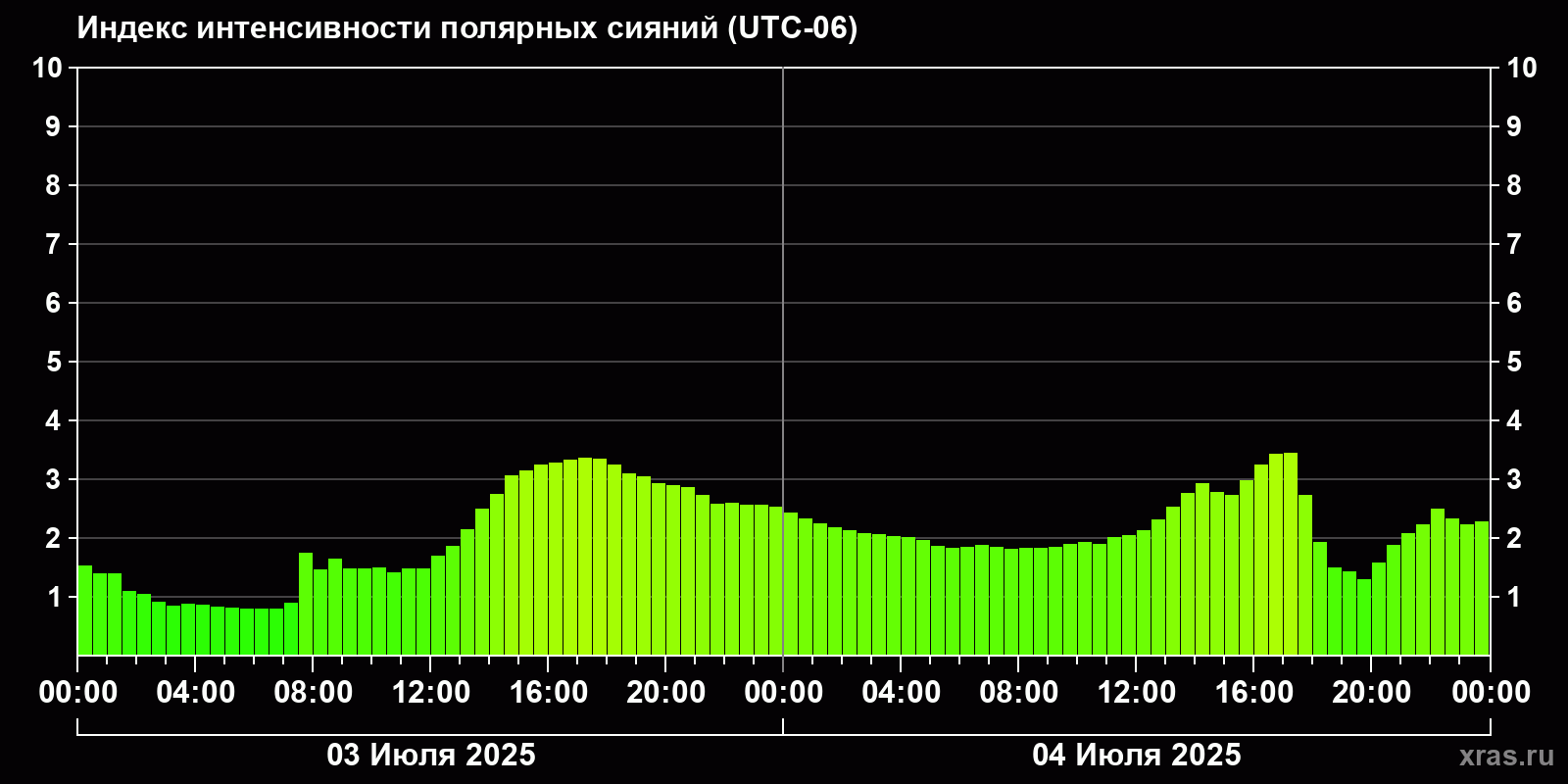 Изменения индекса интенсивности полярных сияний с 2025-07-03 по 2025-07-04 по местному времени