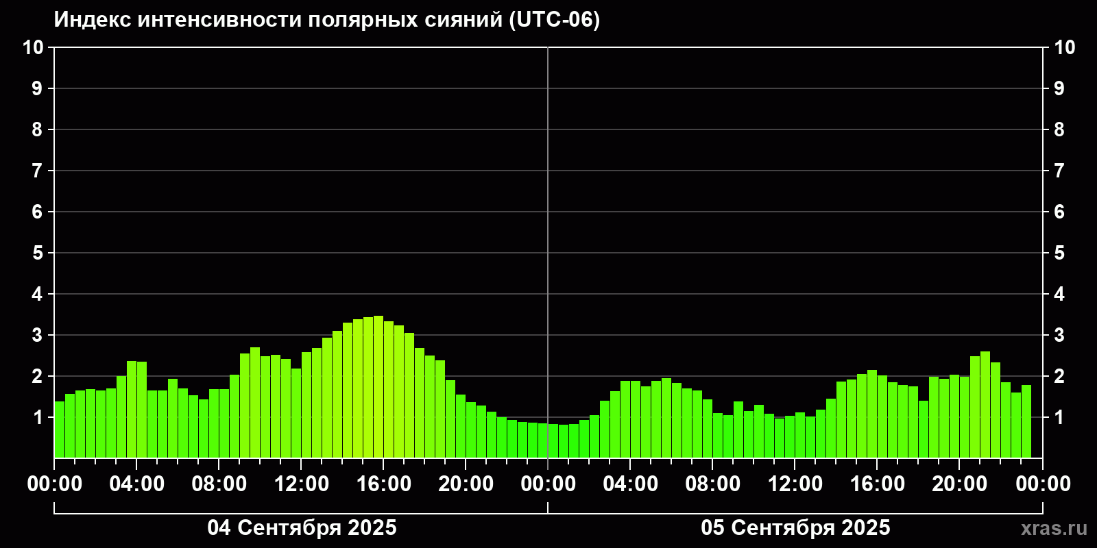 Изменения индекса интенсивности полярных сияний с 2025-09-04 по 2025-09-05 по местному времени