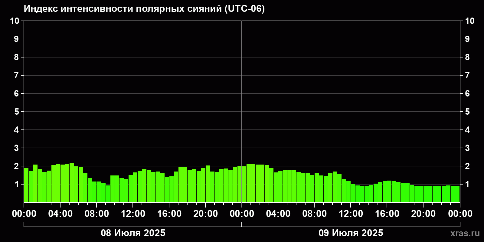 Изменения индекса интенсивности полярных сияний с 2025-07-08 по 2025-07-09 по местному времени