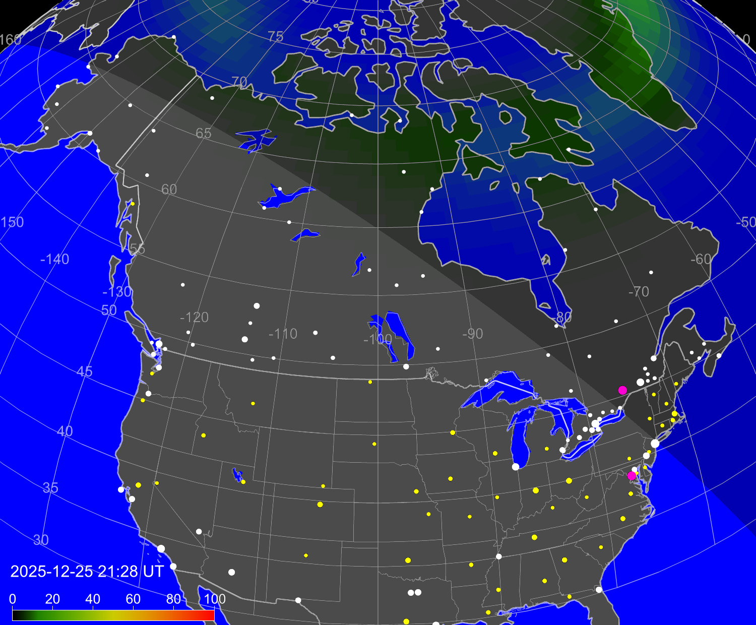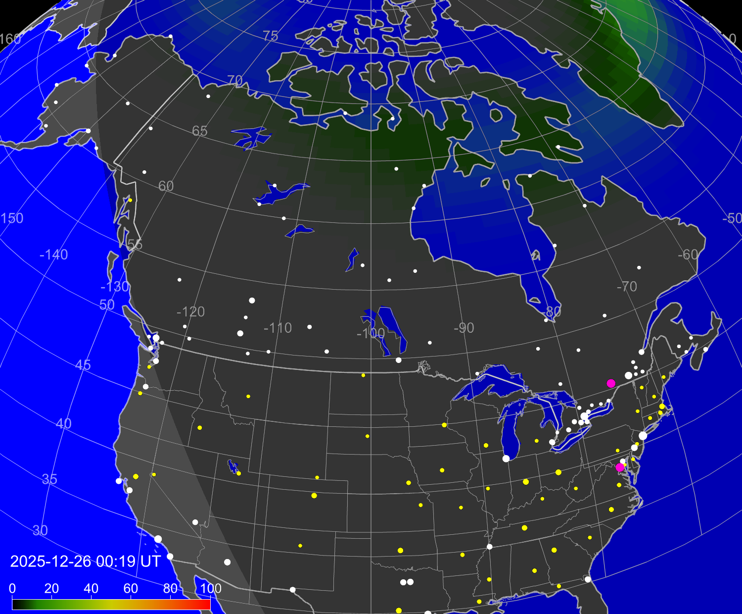 Вероятность полярных сияний в городах Канады