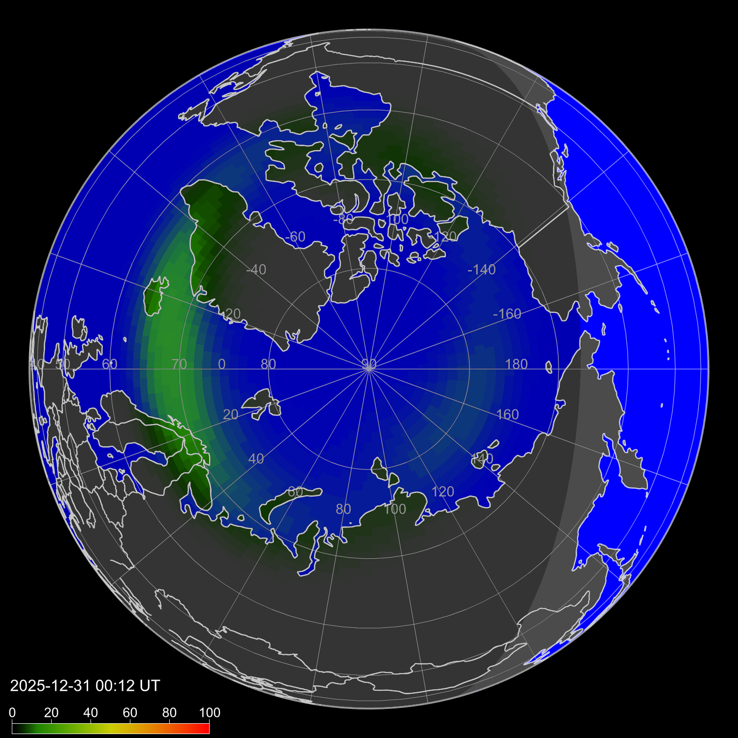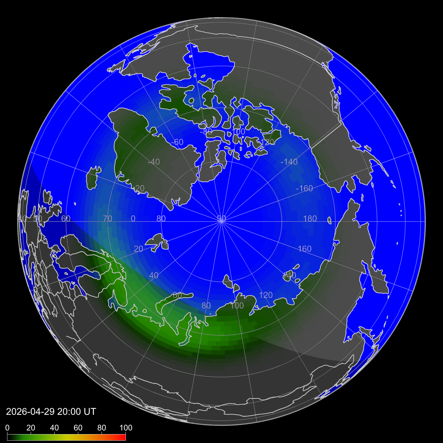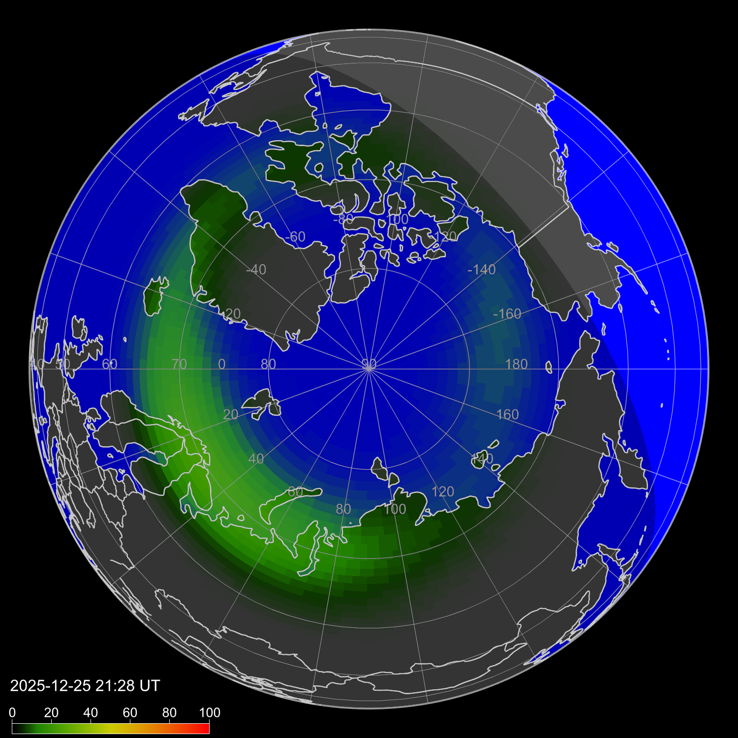 Индекс интенсивности полярных сияний и теоретически возможная широта наблюдений для ночного времени в западном полушарии