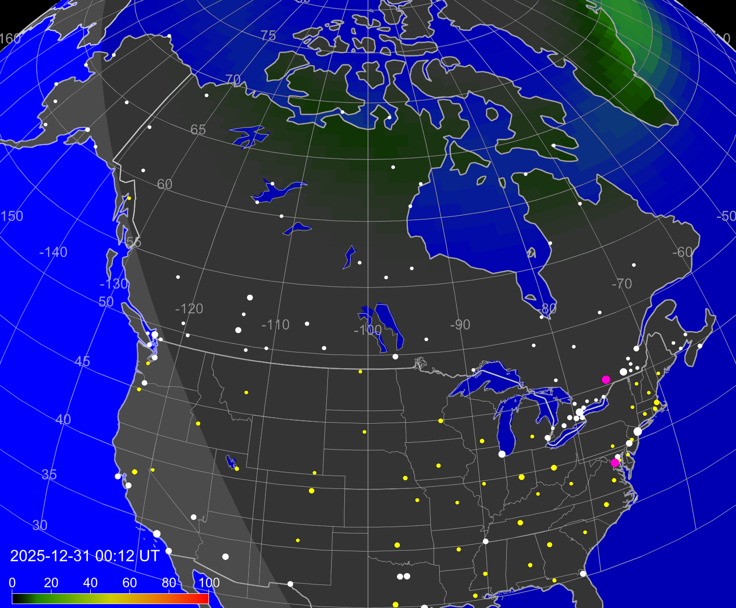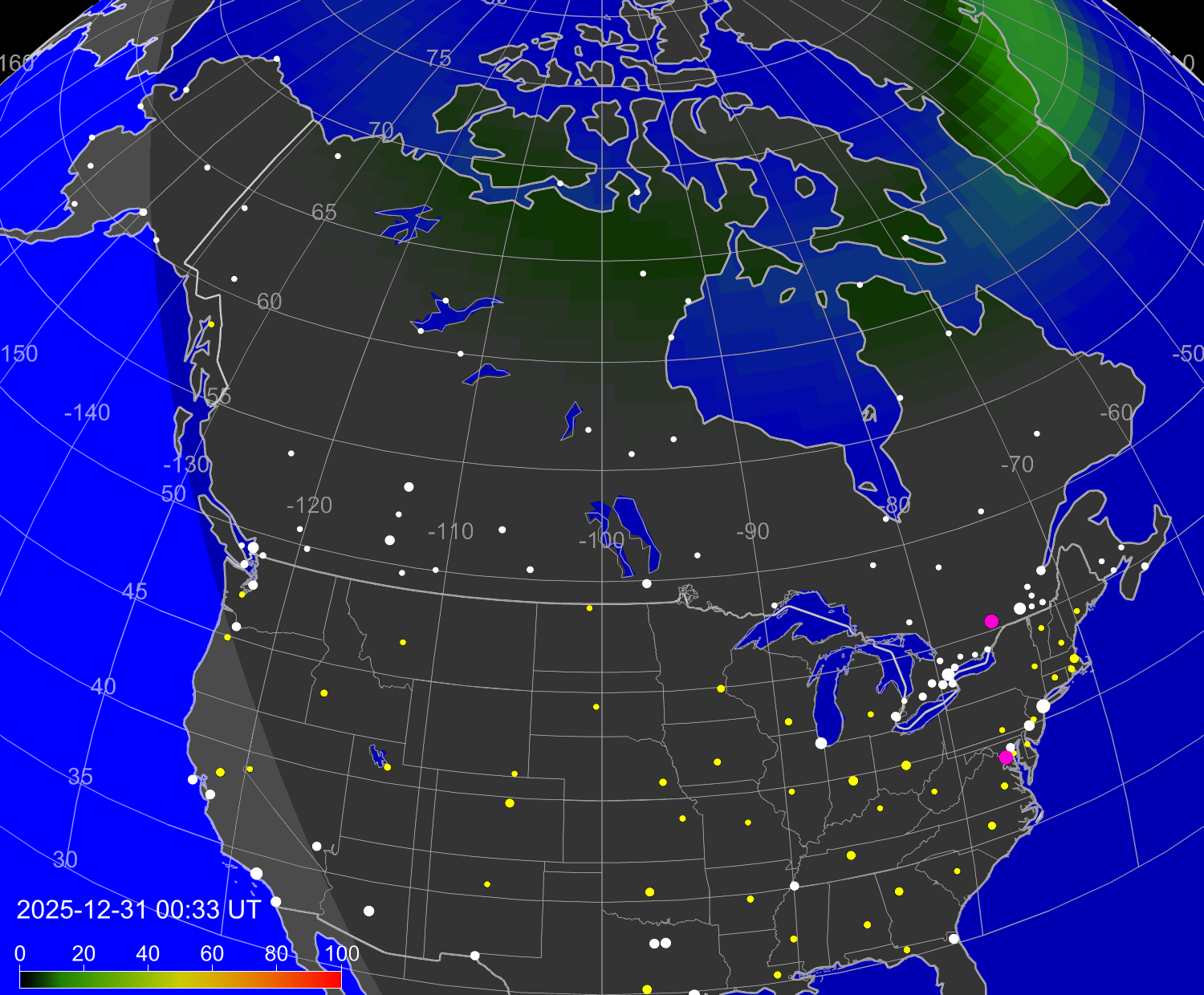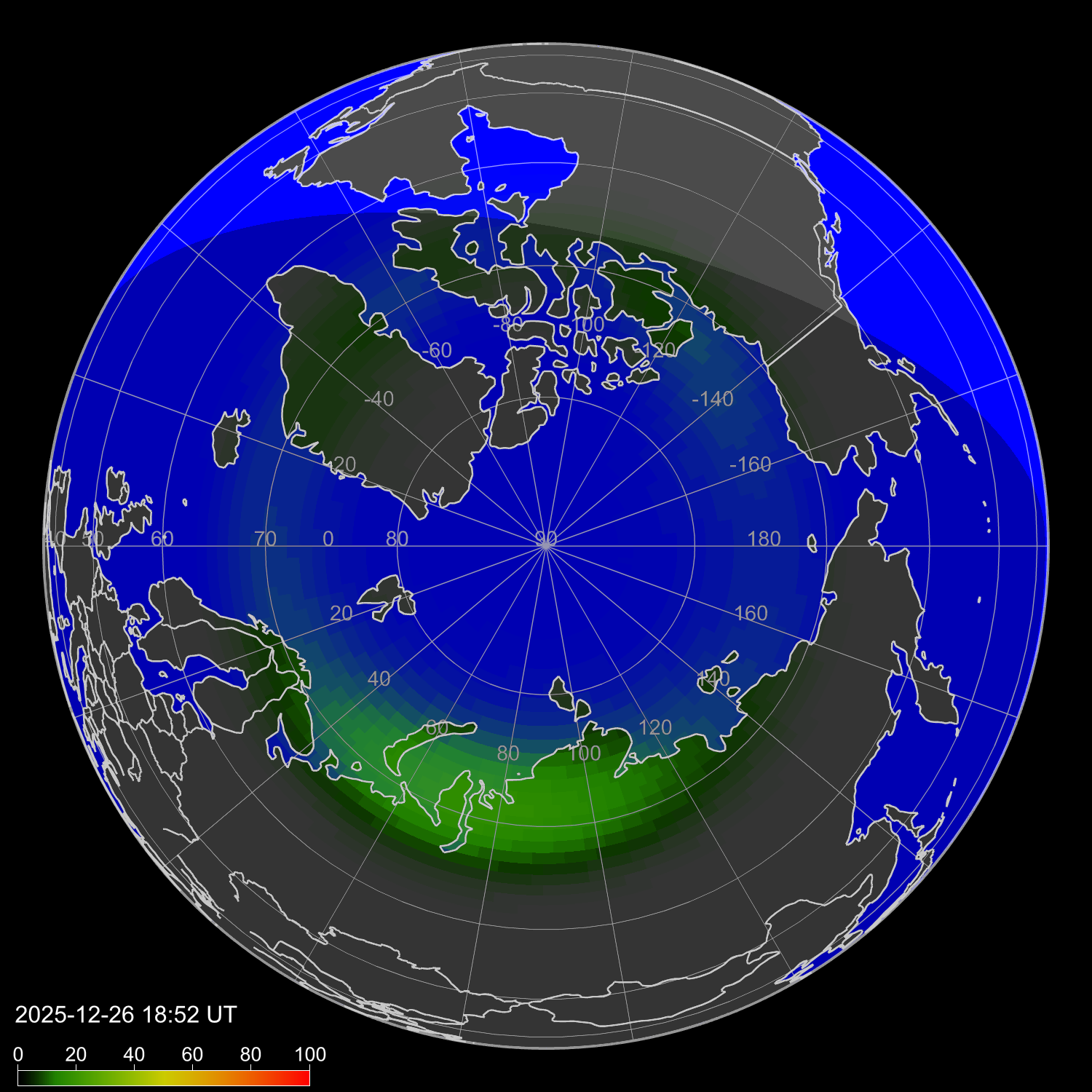 Индекс интенсивности полярных сияний и теоретически возможная широта наблюдений для ночного времени в западном полушарии