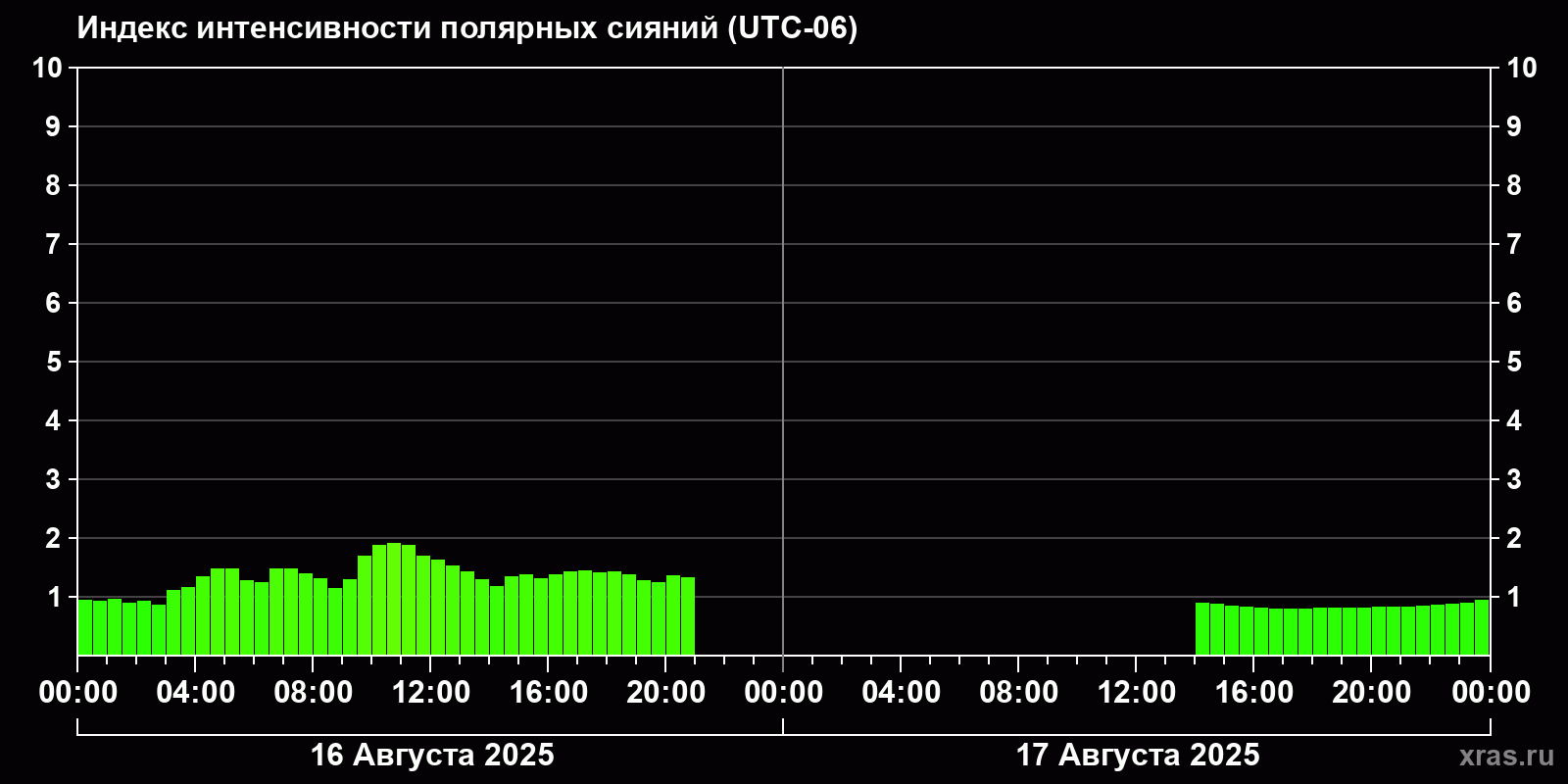 Изменения индекса интенсивности полярных сияний с 2025-08-16 по 2025-08-17 по местному времени